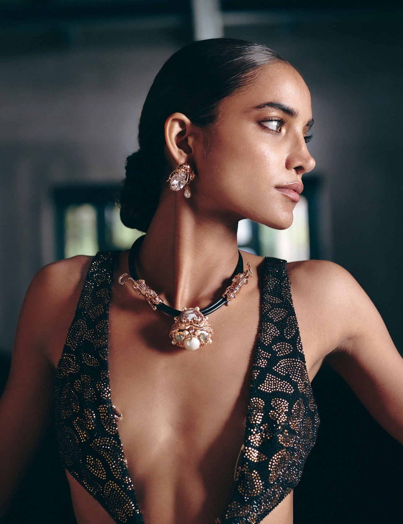 Each earring begins with a tiny leopard poised at the top, its golden form curling around a luminous pearl. Suspended below, a faceted crystal orb catches the light in shifting planes, as if the leopard were emerging from the gem itself, its gaze alive with intensity. Finished in 22k rose gold, the design fuses whimsy with tradition — a wild creature cloaked in elegance. A sculptural droplet of the jungle, it bridges fragility and ferocity, instinct and grace.