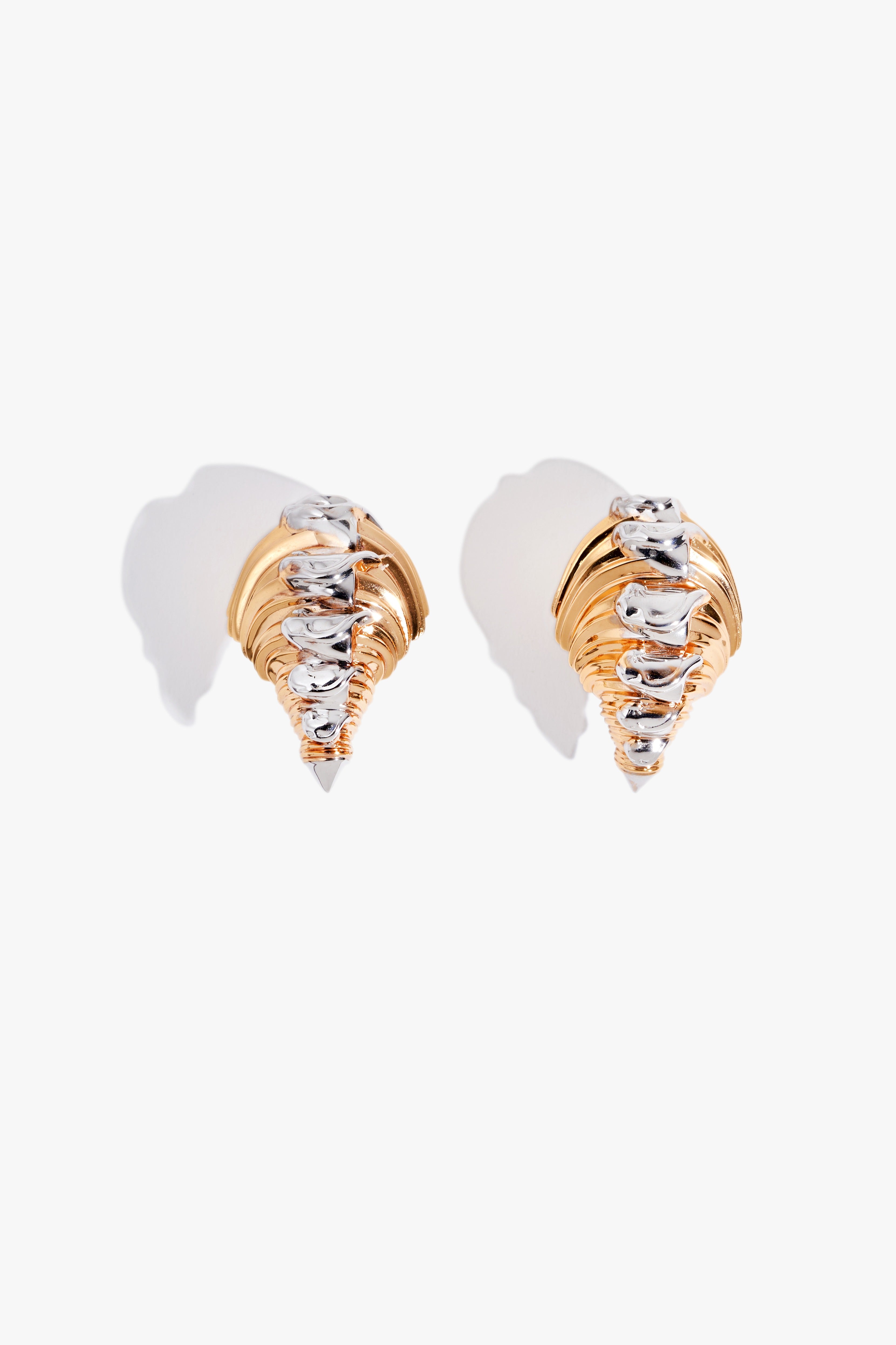 Born of contrast and shaped like a spiralling horn, it is cast in metal, finished in 22k gold, and traced with silver accents. The Koko Conch Shell Earrings cling to the ear like a relic reborn: a jewel of duality, where nature becomes couture and adornment becomes art.