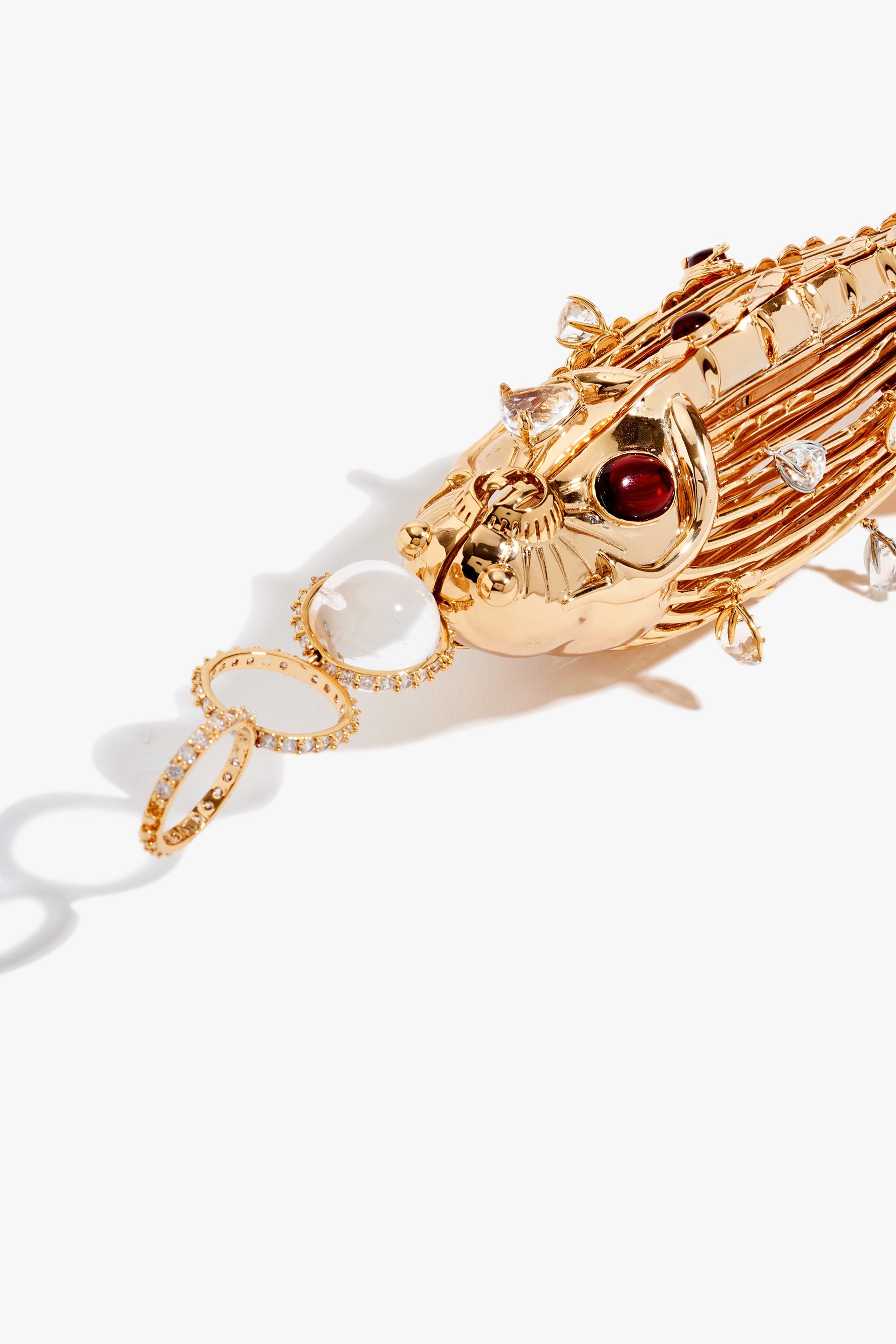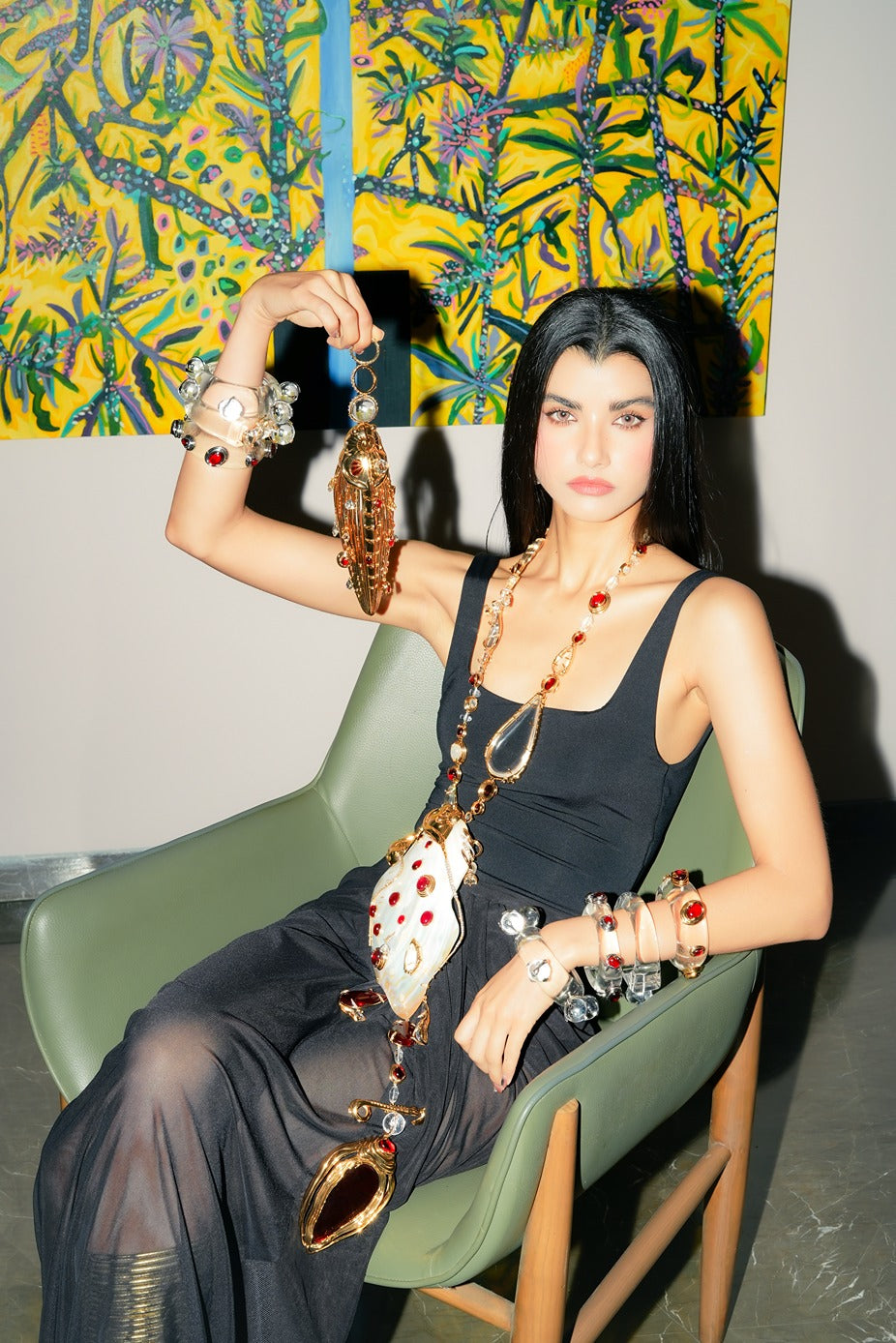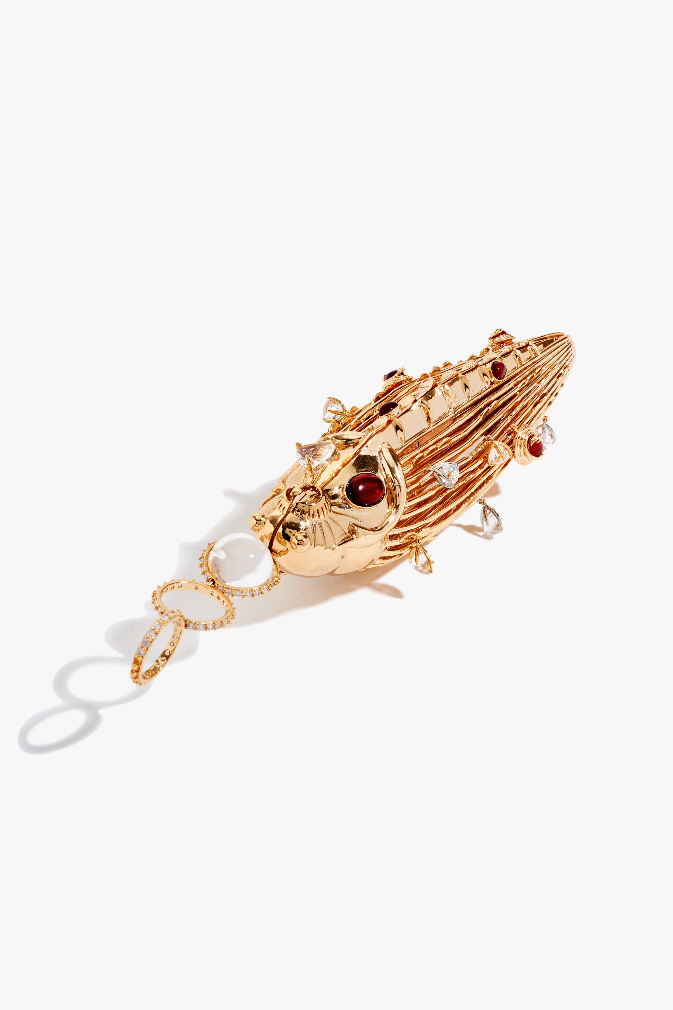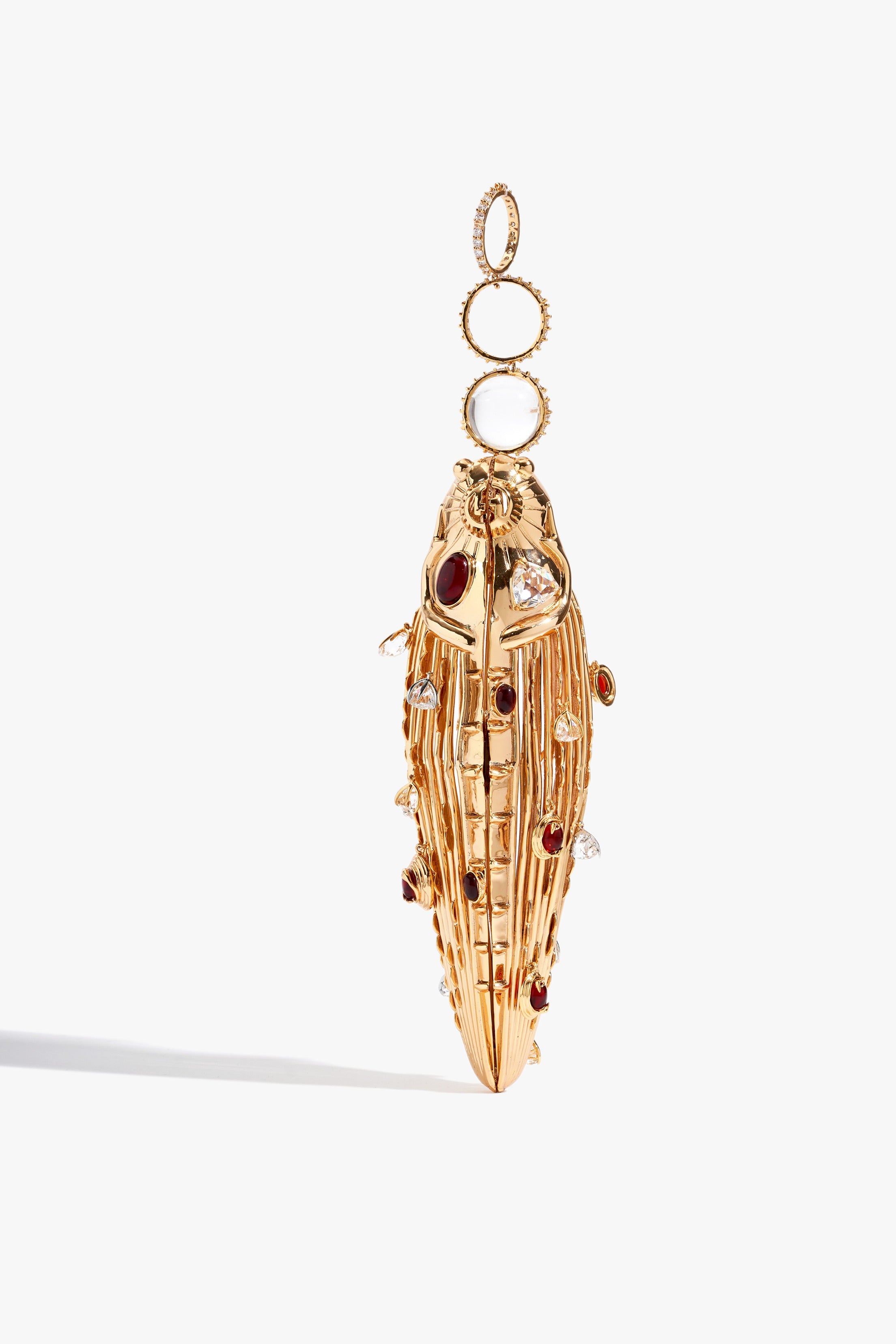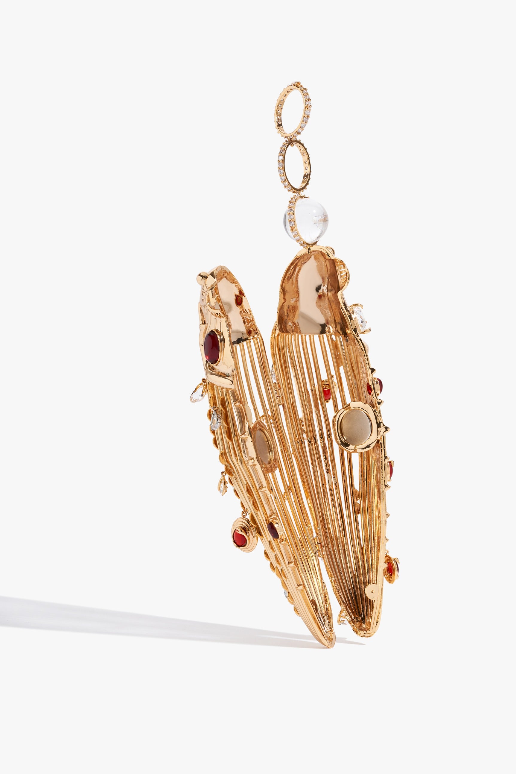 A jewel recast as a bag. Sculpted in metal and finished in 22k gold, the Koko Bag gleams with jewelled accents of crimson glass stones and Swarovski crystals. At its heart lies the anatomy of the House’s emblem: the Koko Bug: connected with a resin sphere and a cubic zirconia orbit, suspended from a golden ring handle that transforms function into icon. More than ornament, it becomes wearable sculpture: a vessel of light, a couture relic made by hand. An emblem of self-evolution, it reflects the beauty of becoming.