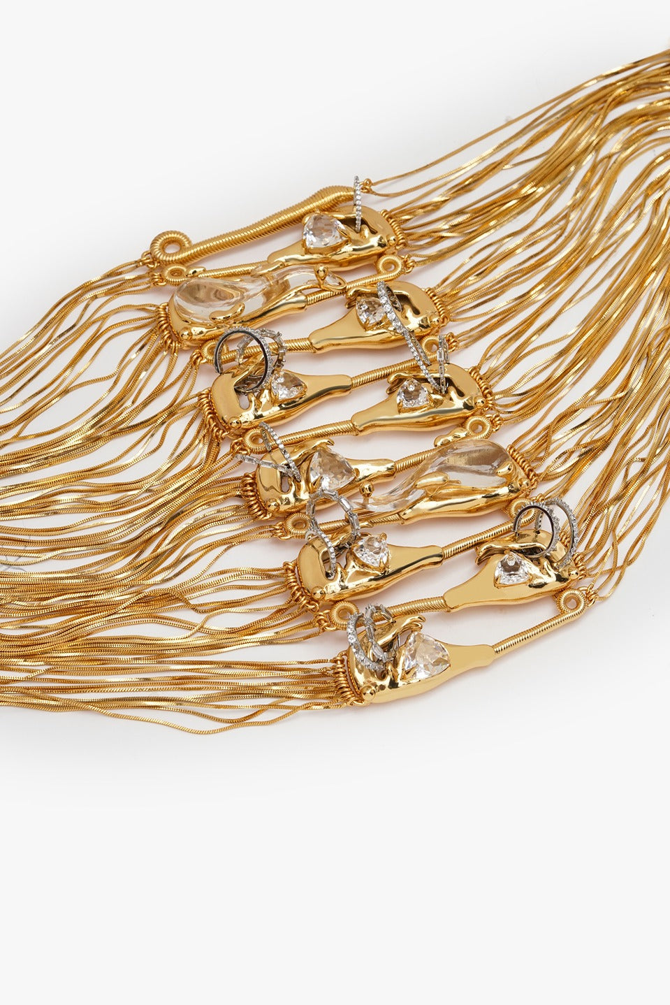 A structure of metamorphosis, the KOKO Sigil Pin Belt reimagines the safety pin as sculpture: cast in metal, finished in 22k gold, and punctuated with silver accents and cubic zirconia. Guard-pin motifs interlock across the waist in a luminous lattice, transforming restraint into ornament. Adjustable in fit, it encircles the body with sculptural precision and couture gravity, turning jewellery into architecture and the body into canvas.
