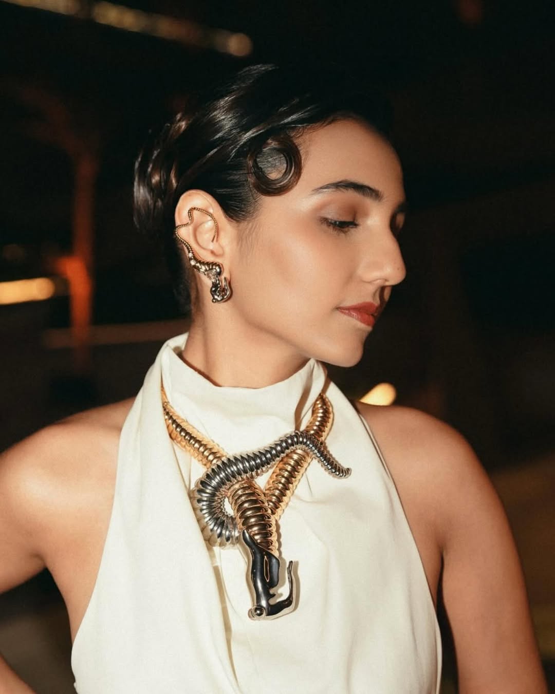 The Seris Dual Choker entwines two sculptural coils: one plated in 22k gold, the other accentuated in silver. Draped at the neck, its duo-metallic form evokes the scaled body of a serpent, fluid yet precise. Jewellery becomes armour, embodying duality and eternal return: a relic of metamorphosis worn close to the skin.