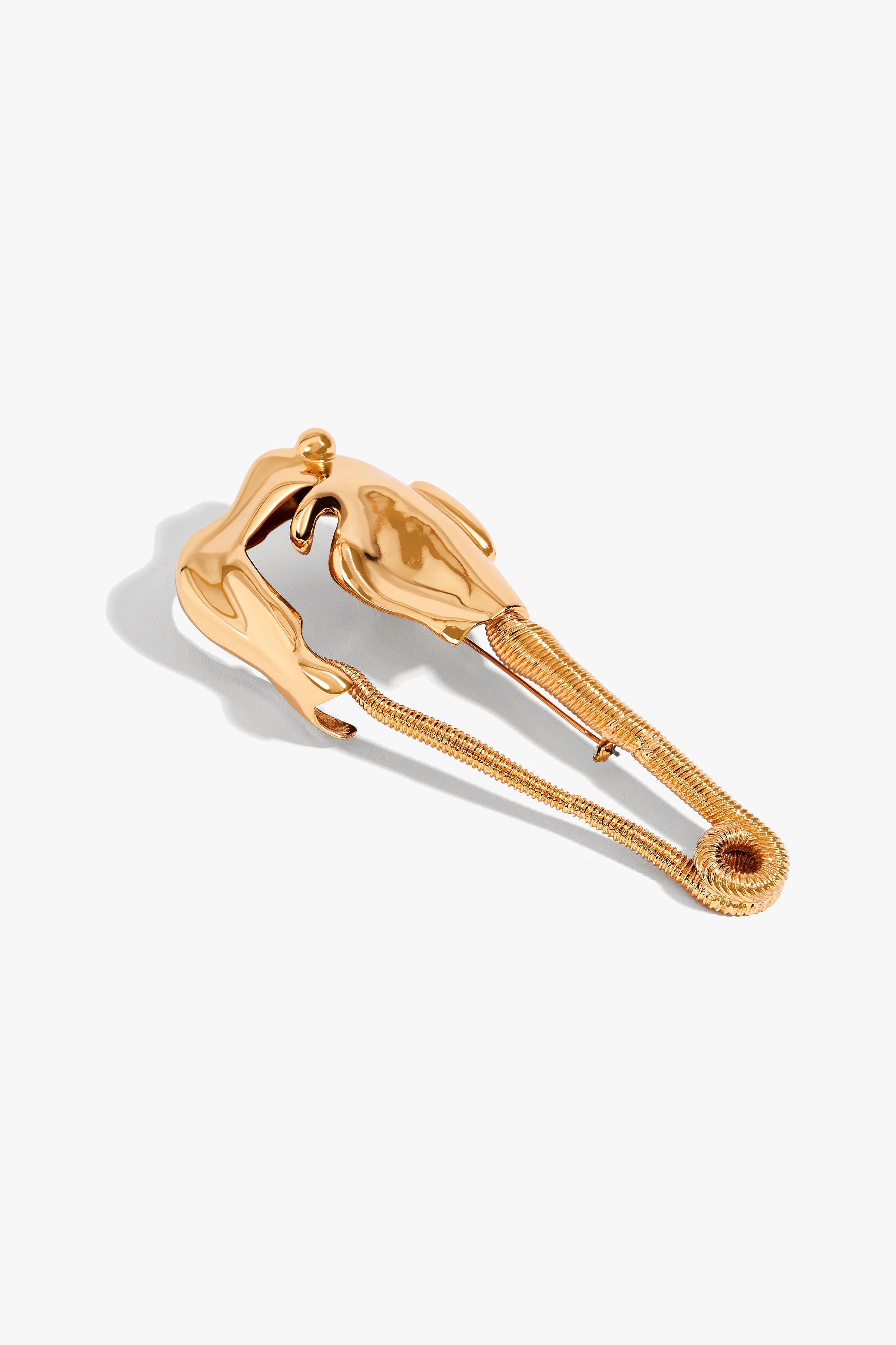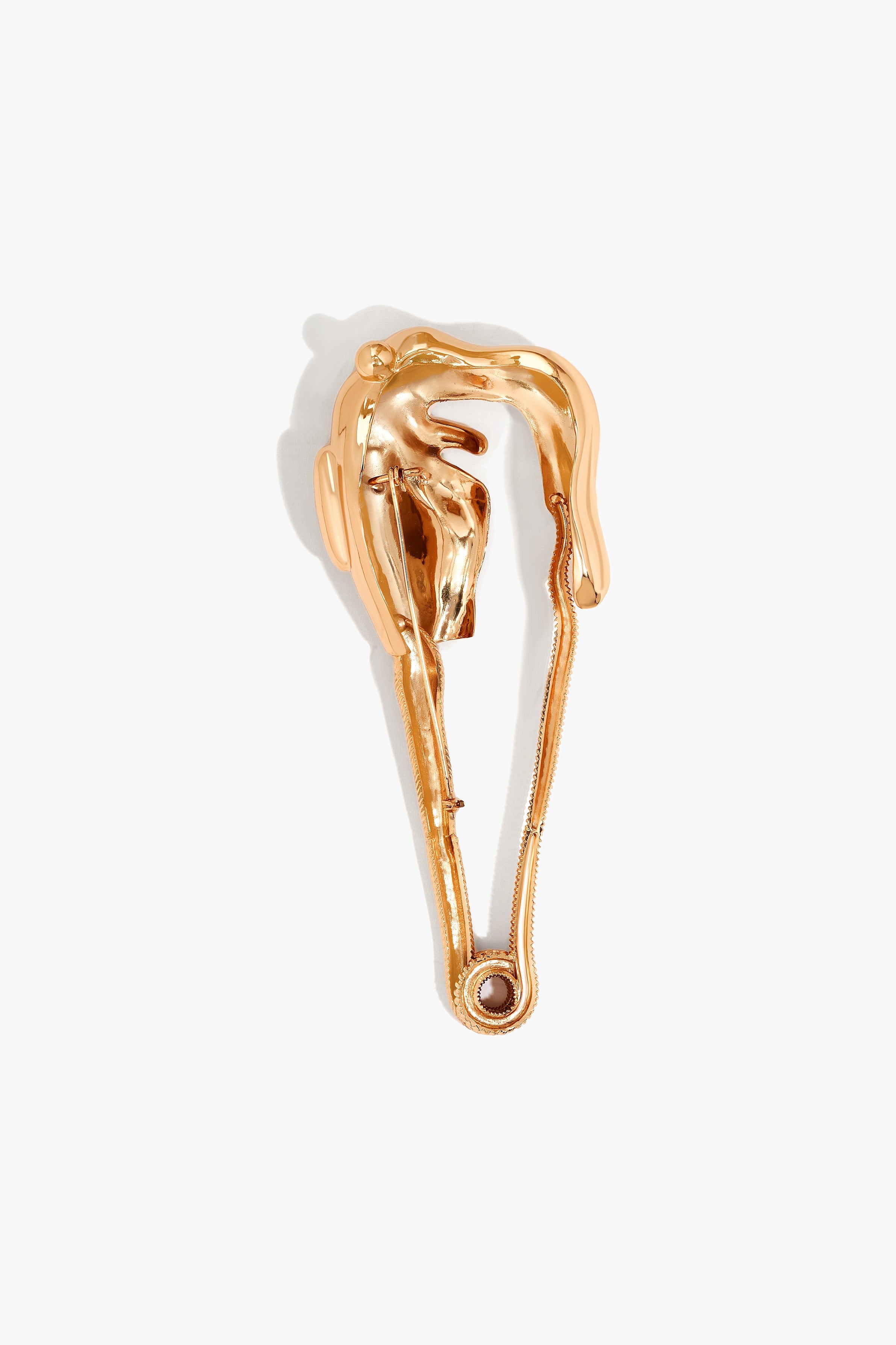 Cast in metal and finished in 22k gold, the Sigil Gardien Brooch folds into a molten hinge-like form, precise and resolute, fastening not only fabric but intention. Resting on the lapel, it becomes a chic statement of architectural hardware: a quiet manifesto of metamorphosis, both talisman and adornment.