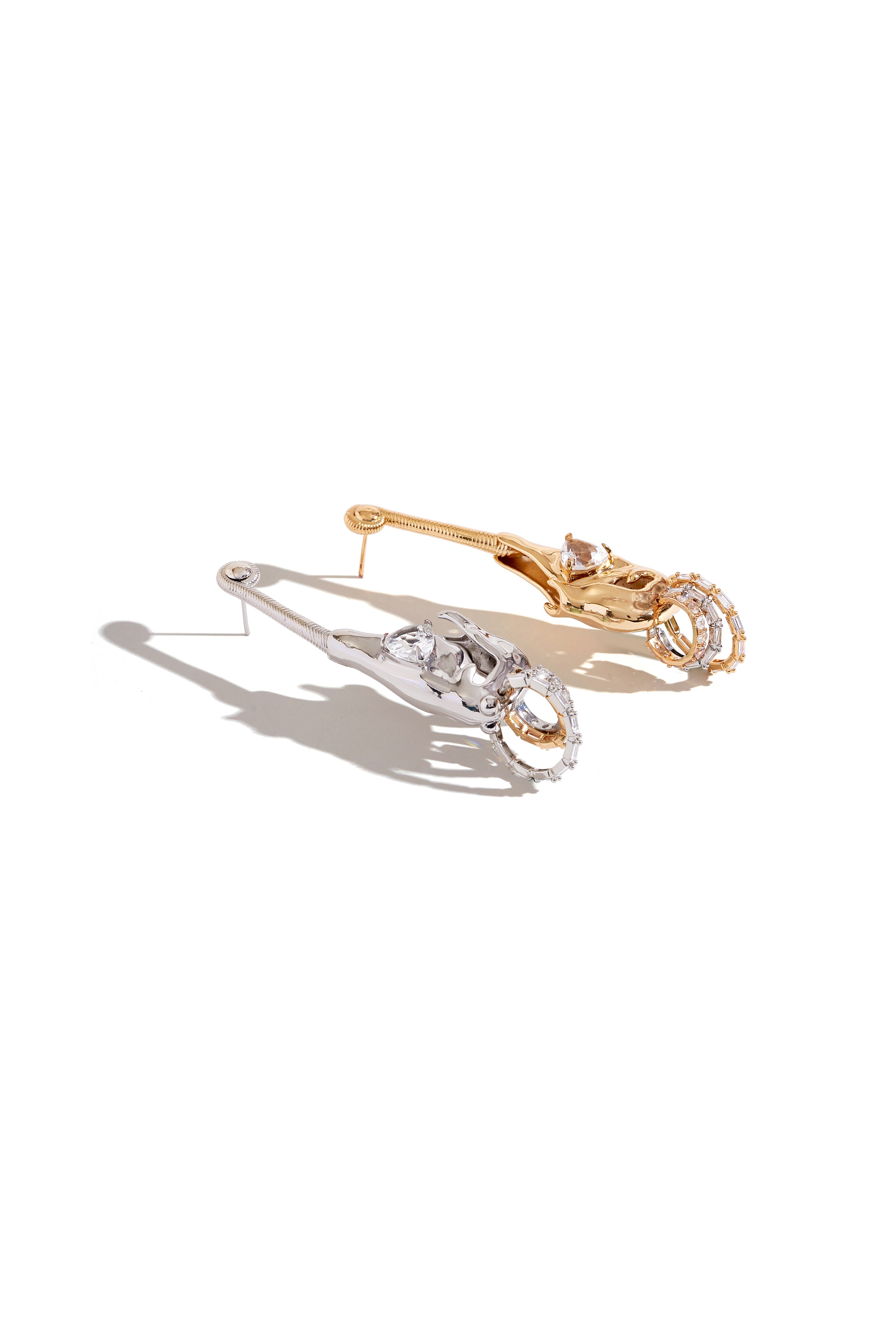 An elongated guard-pin motif, cast in metal and plated in 22k gold with silver accents and cubic zirconia stones. Minimalist in line yet bold in scale, the KOKO Sigil Pin Earrings fall from the ear as luminous exclamations, pared back to their most sculptural essence.