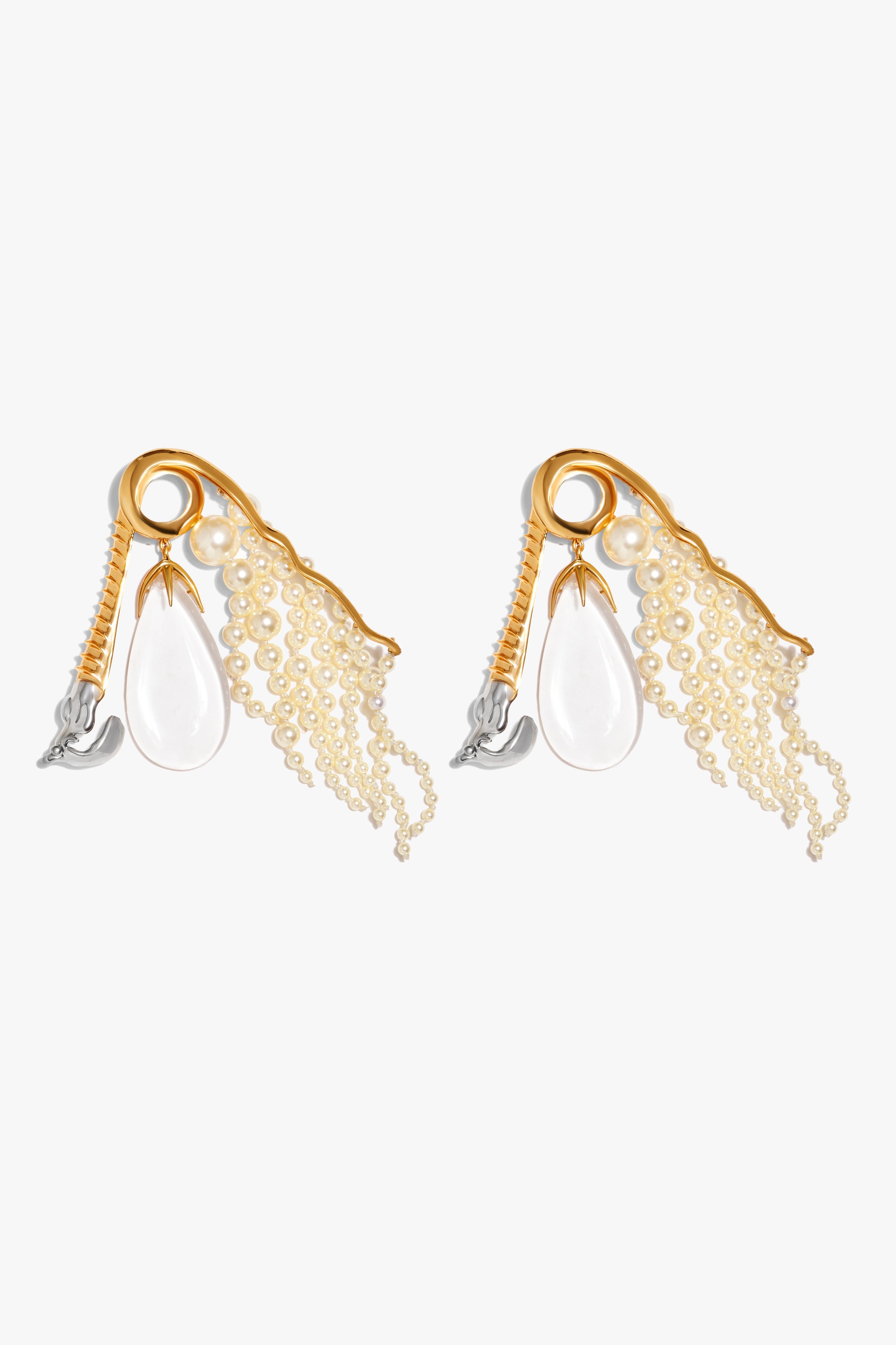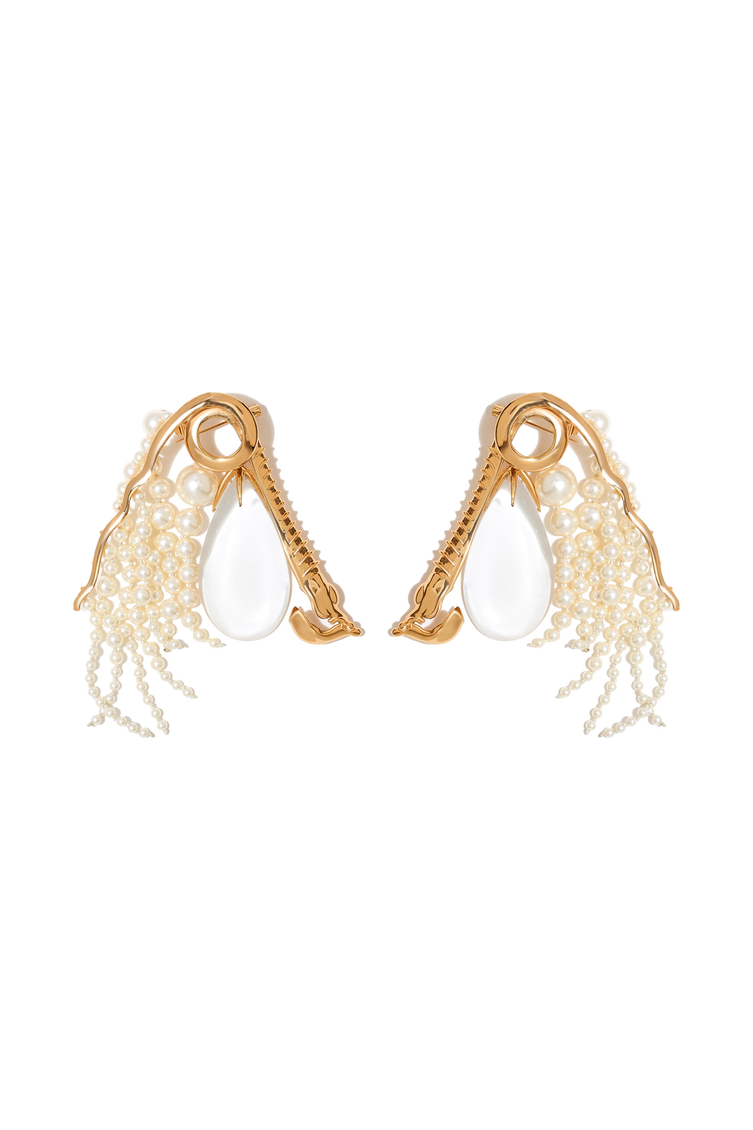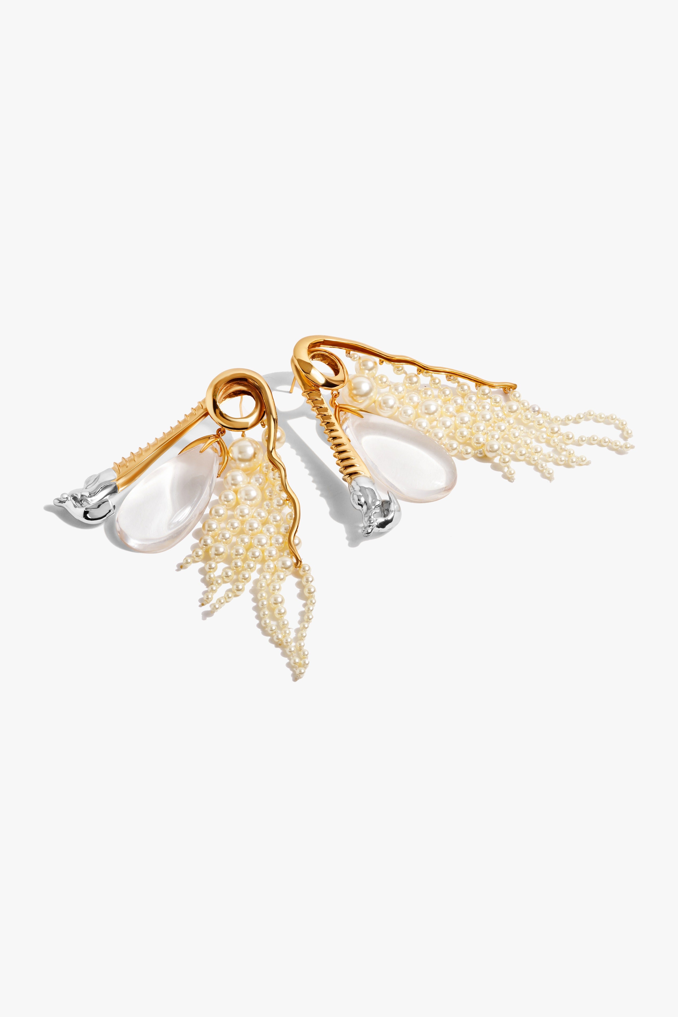Cast in metal and plated in 22k gold, the KOKO Sigil Cascade Earrings reimagine the safety pin as an open triangular frame. From its sculptural hinge, Swarovski pearls fall in radiant descent, anchored by an acrylic drop that sways like a suspended jewel. Iconic and versatile, perfect with crisp blazers, flowing slip dresses, or elevated eveningwear.