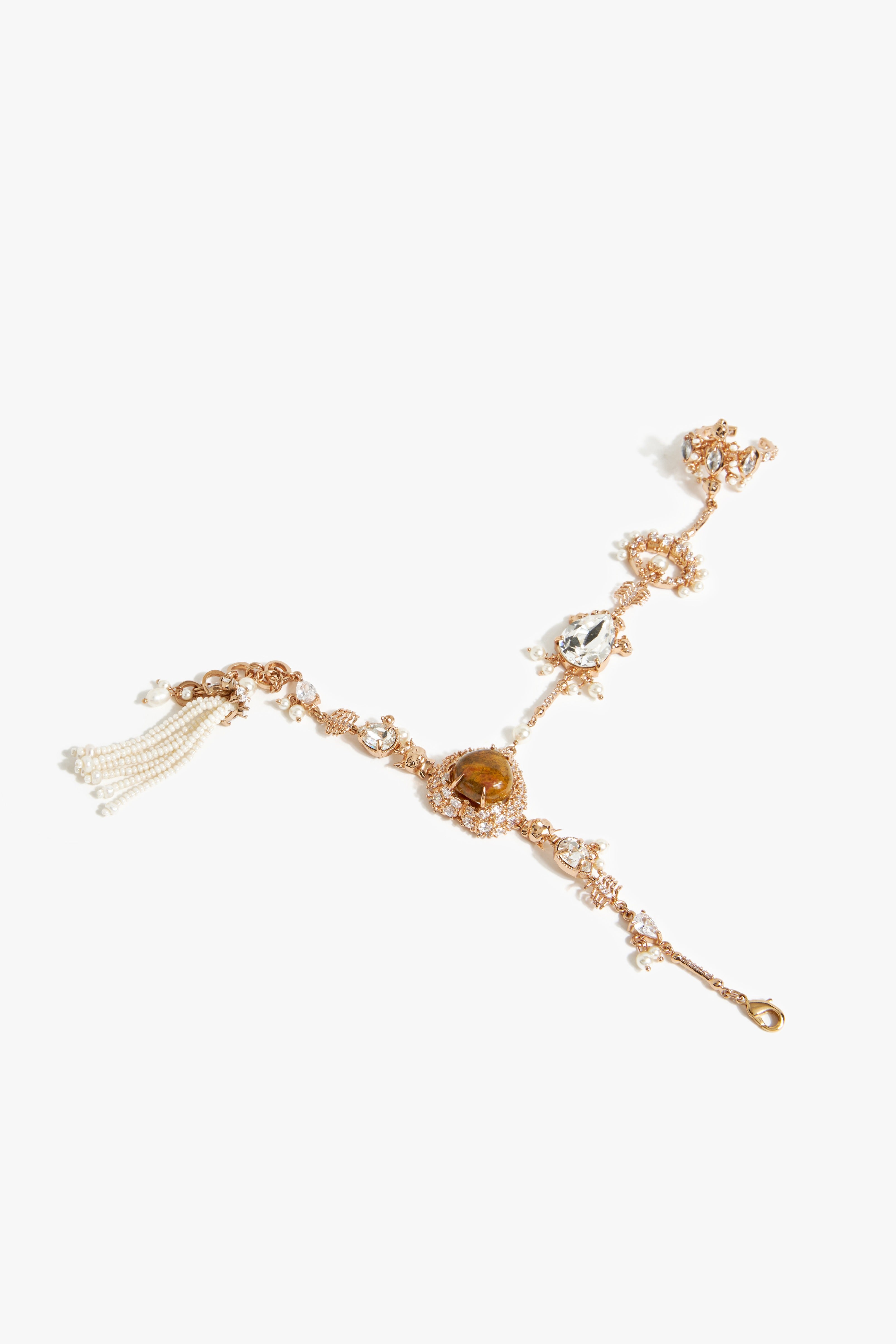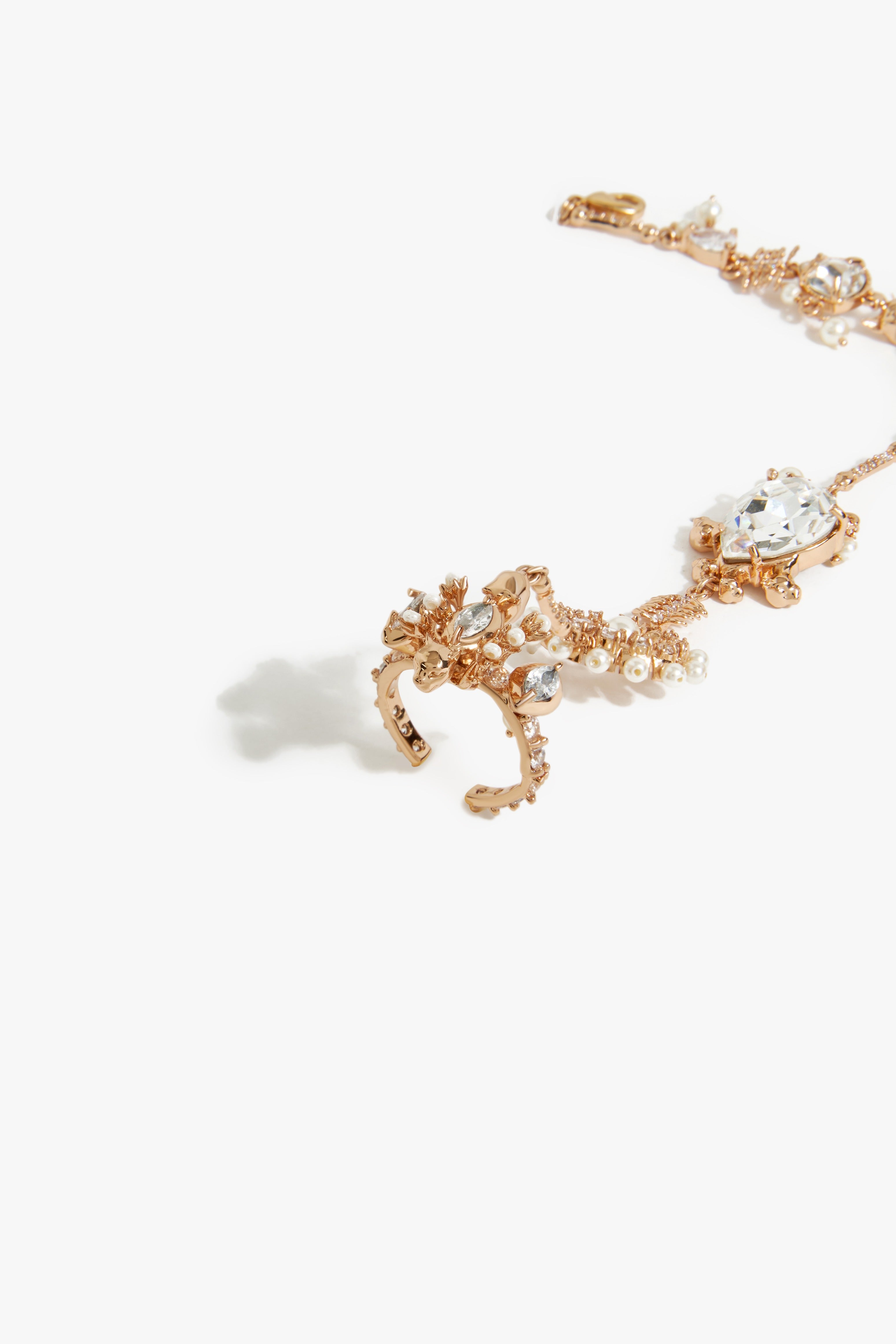Six sculpted leopard heads form the intricate details of this hand harness, each a guardian of strength and presence. Marquise and oval-cut cubic zirconia glimmer with precision, while round Swarovski pearls and delicate Jaco beads add soft luminosity. A pear-shaped Swarovski stone and a drop of ancient fossil coral anchor the piece, their textures evoking nature’s quiet grandeur. Cast in metal and finished in 22k rose gold, the harness drapes across the hand like a relic of union.
