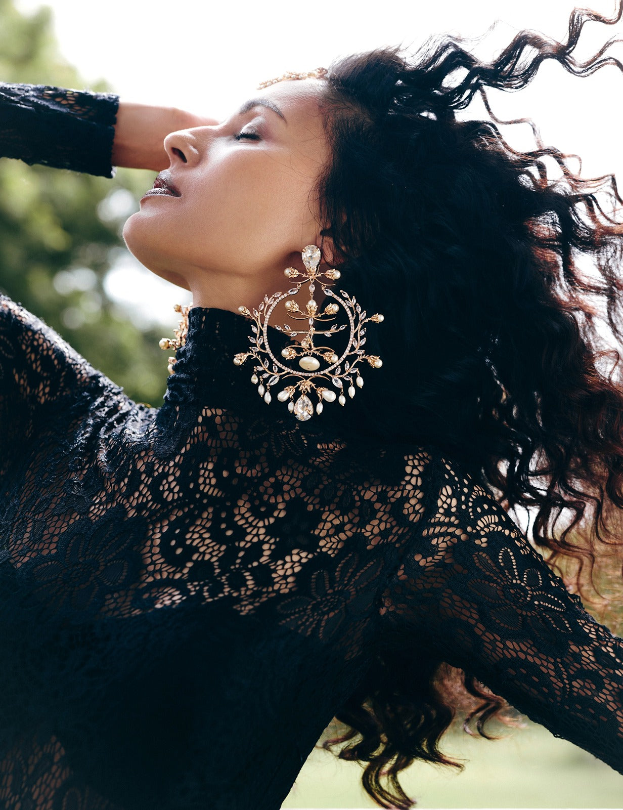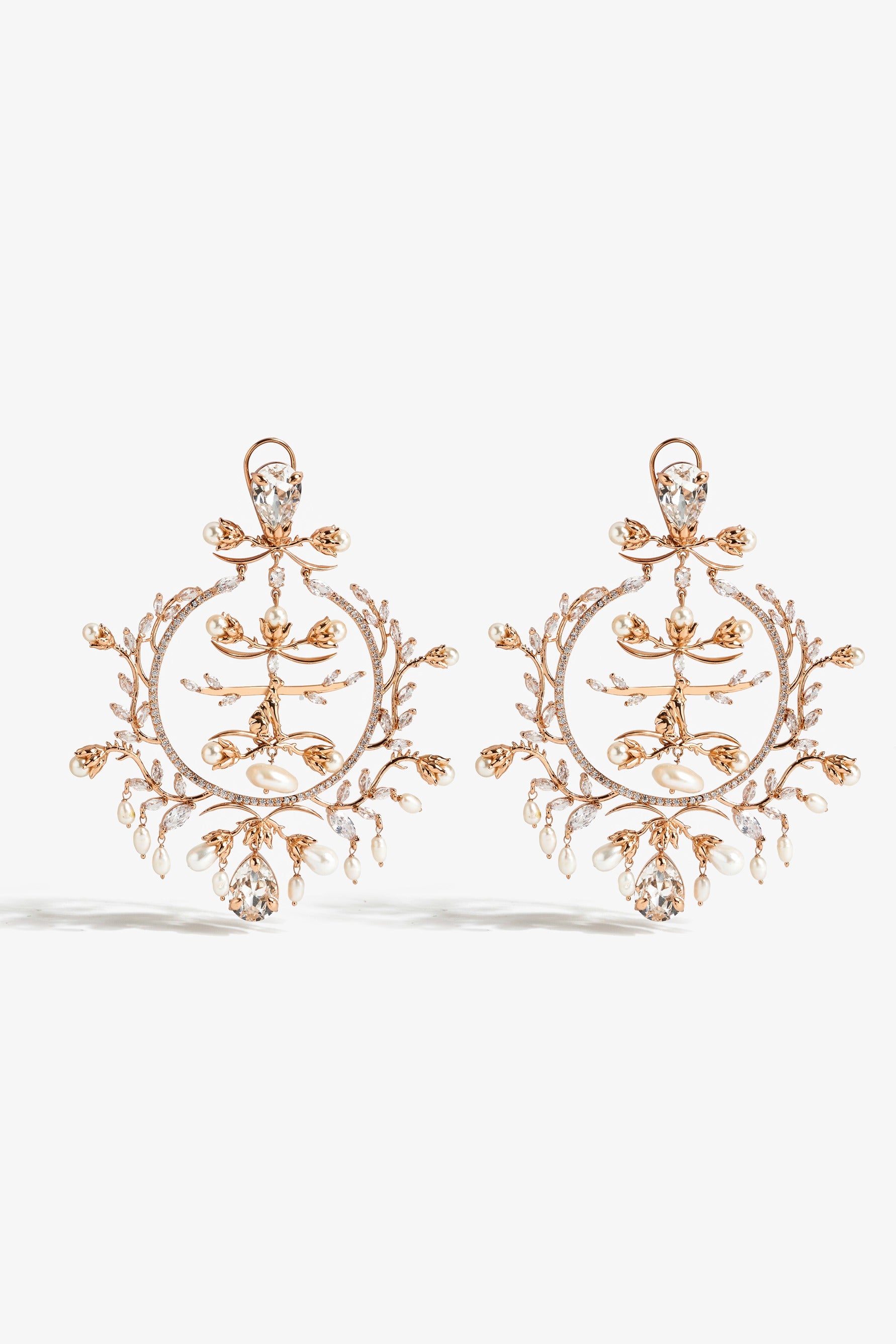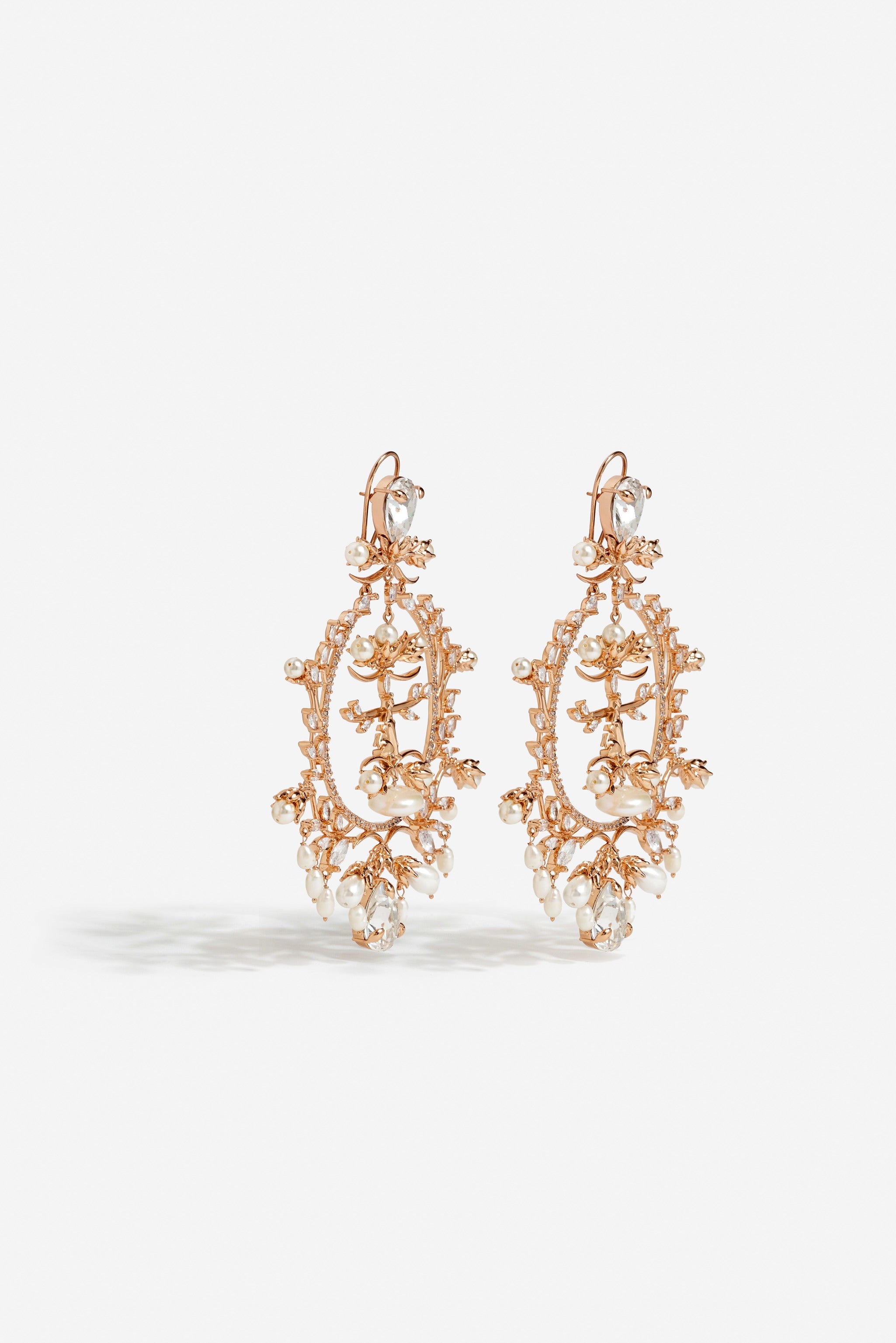 These chandelier earrings bloom like a vine in full cluster. Branches of delicate gold fan outward, each tip crowned with a grape-like pearl drop and inset with pinpricks of cubic zirconia dew. Flowing downward in an elegant cascade and finished in 22k rose gold, the Feral Pearl Chandbali merges vintage romance with untamed ferocity: a wild bloom rendered in jewel and light.
