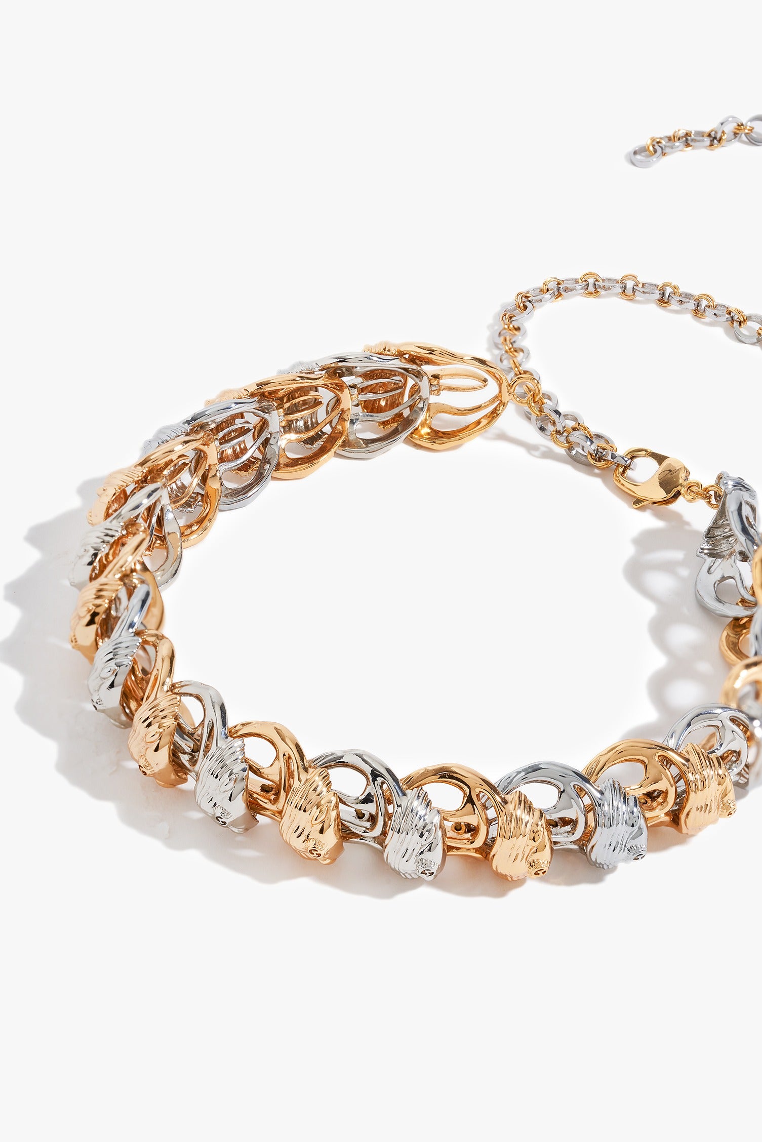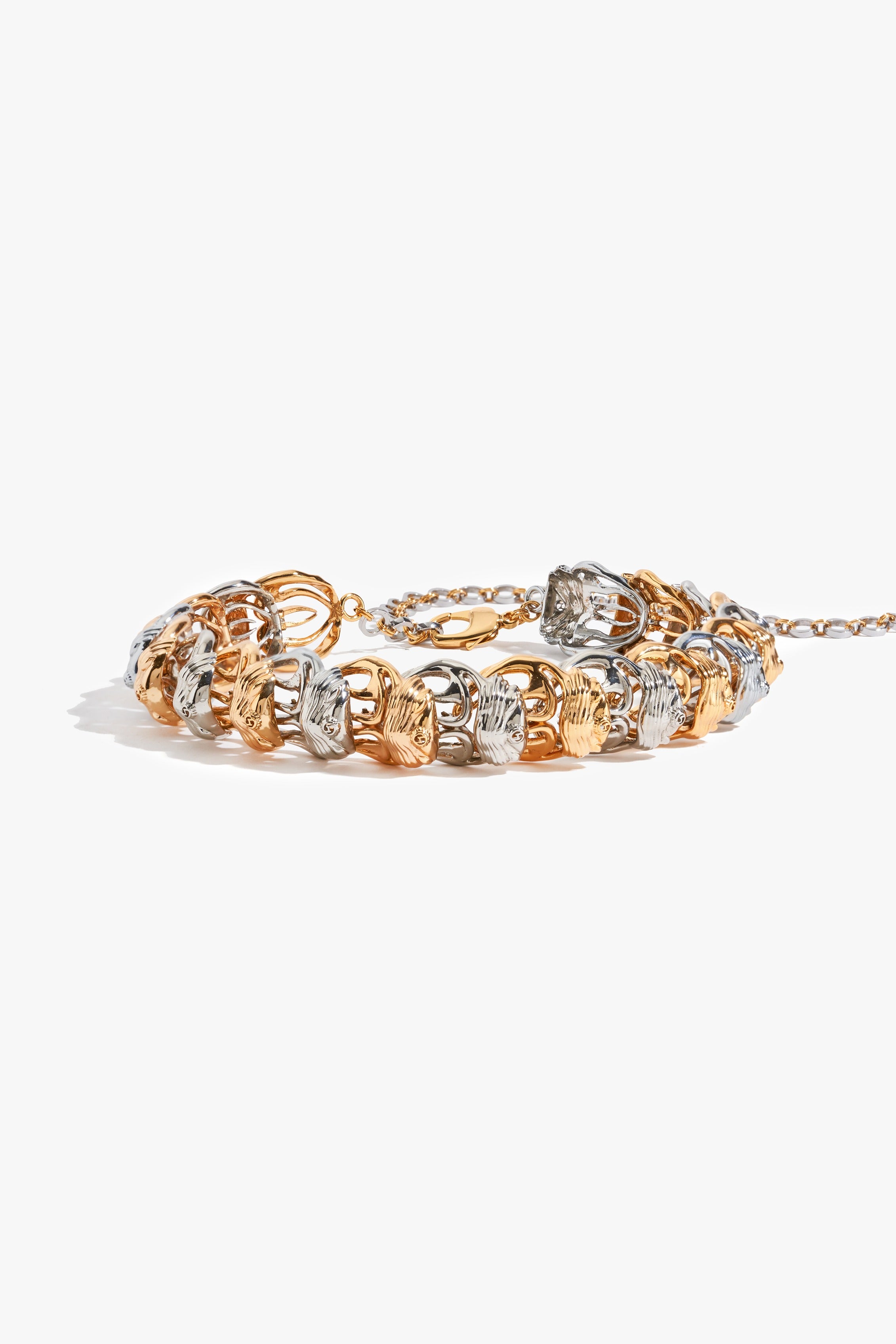 A bulbous sculpture for the body, this necklace is cast in metal and plated in 22k gold with silver accents. Its duo-metallic surface curves in bold, organic volumes, embracing the neck with luminous gravity. High design codes resonate through the anatomy of the KOKO Bug in skeletal abstraction, as duo-metallic arcs unfurl from the bud’s head, intertwining structure with light. It is both relic and revelation.