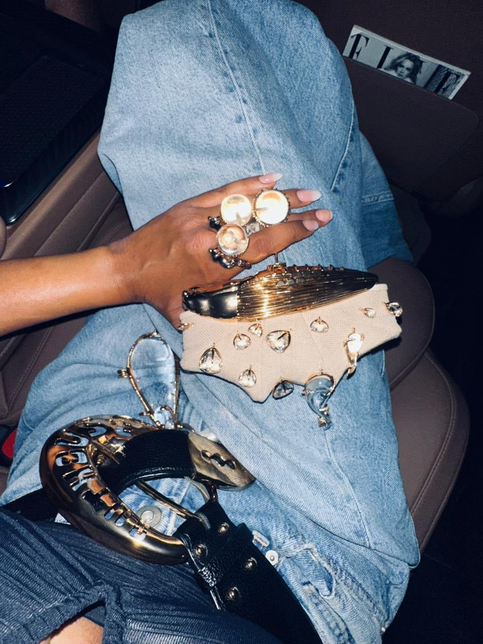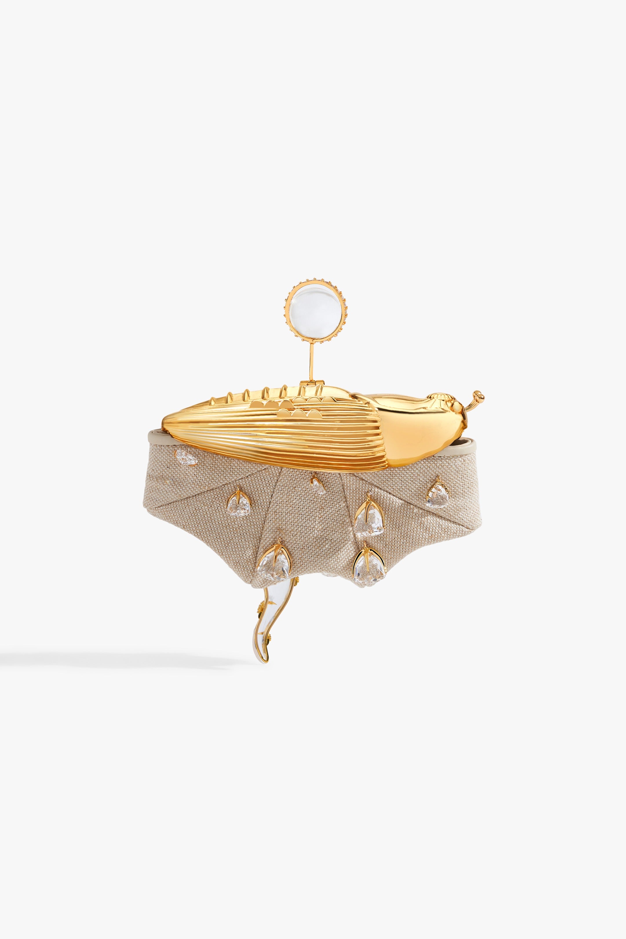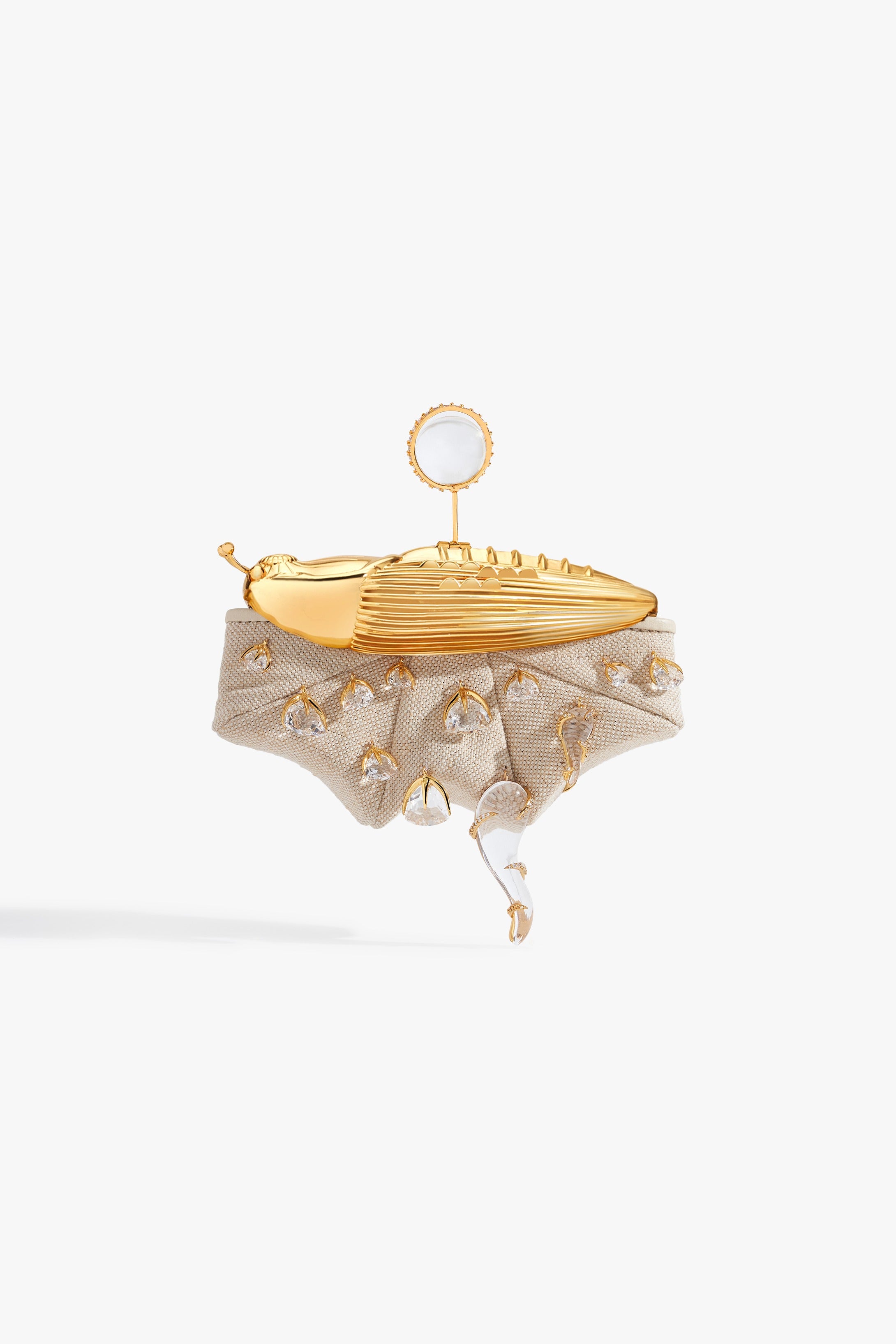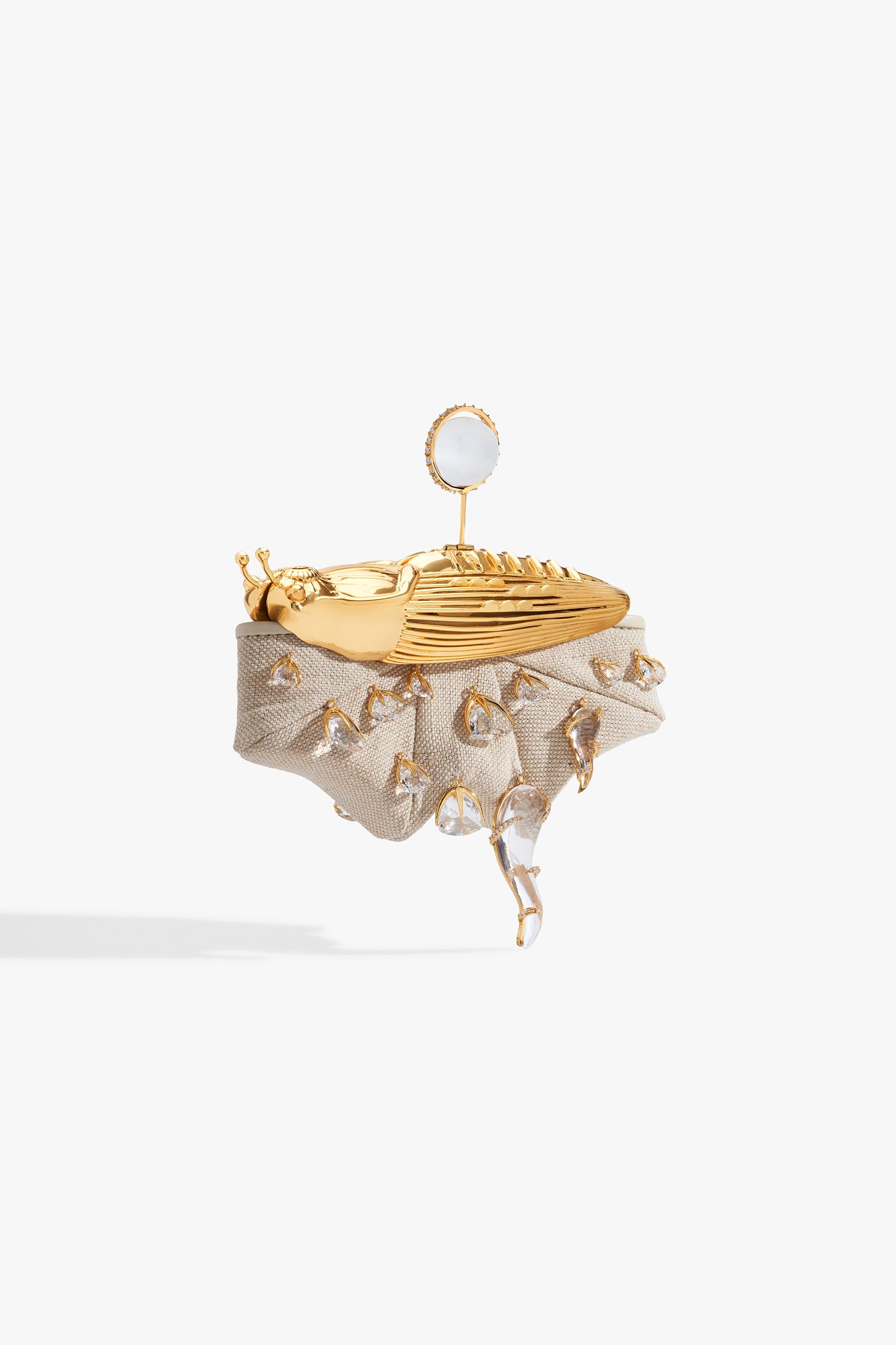 The KOKO Couture Bag evokes a cosmic talisman. 100% natural jute canvas, punctured with constellations of crystal light. At its core, the silver 22k KOKO Bug reigns: emblem of metamorphosis and axis of the House. A circlet of crystal glass crowns the form, each zirconia a star in orbit, radiating sculptural brilliance.
