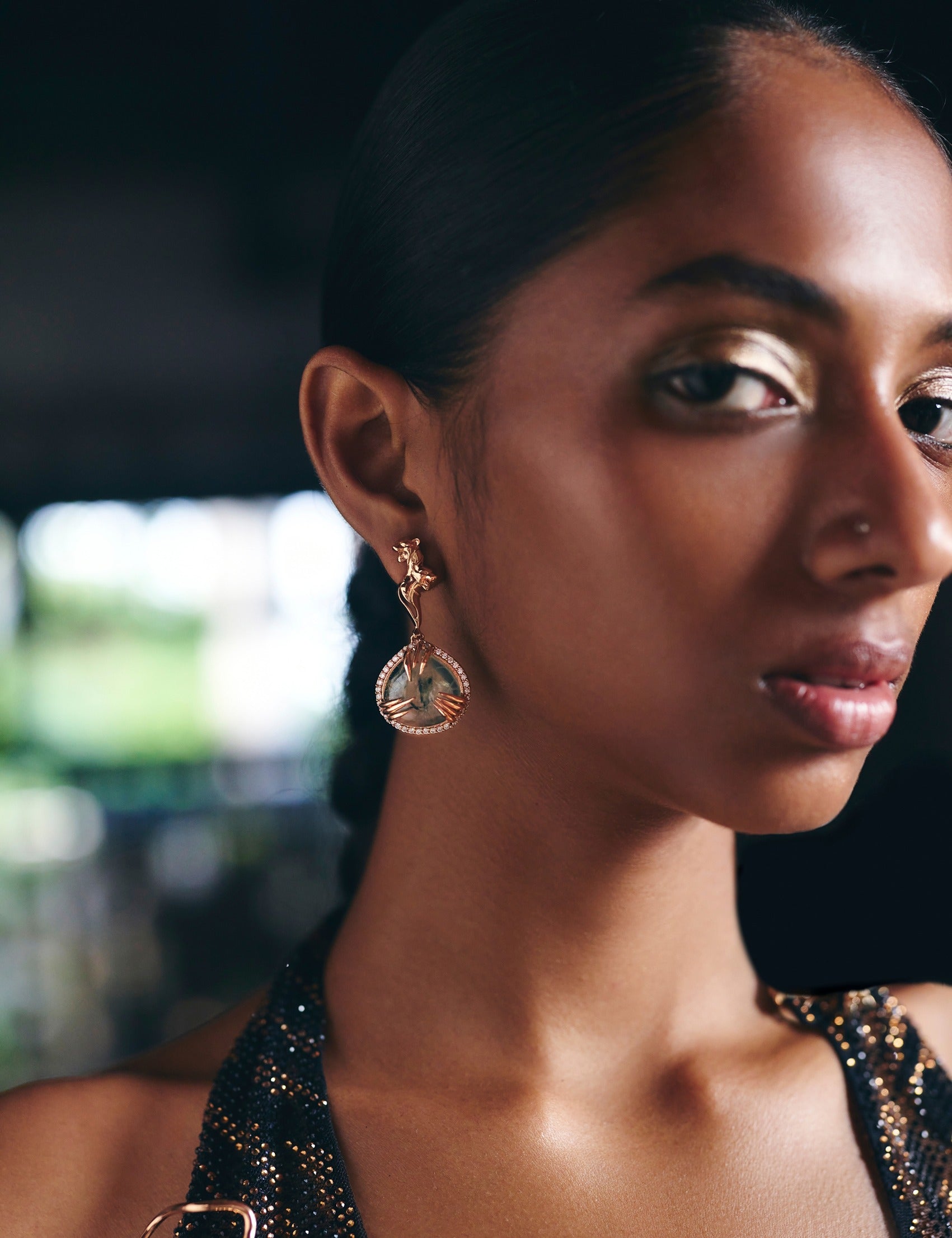 Two wild hearts meet in a silent union, as if twin souls entwined by fate. Leopard motifs curve gracefully around a glowing prehnite orb, a semi precious stone known for clarity, calm, and unconditional love. A constellation of cubic zirconia encircles the gem, adding celestial sparkle. Finished in 22k rose gold, these drop earrings become modern amulets of devotion: versatile enough to pair with ceremonial attire or to lend sculptural elegance to everyday ensembles.