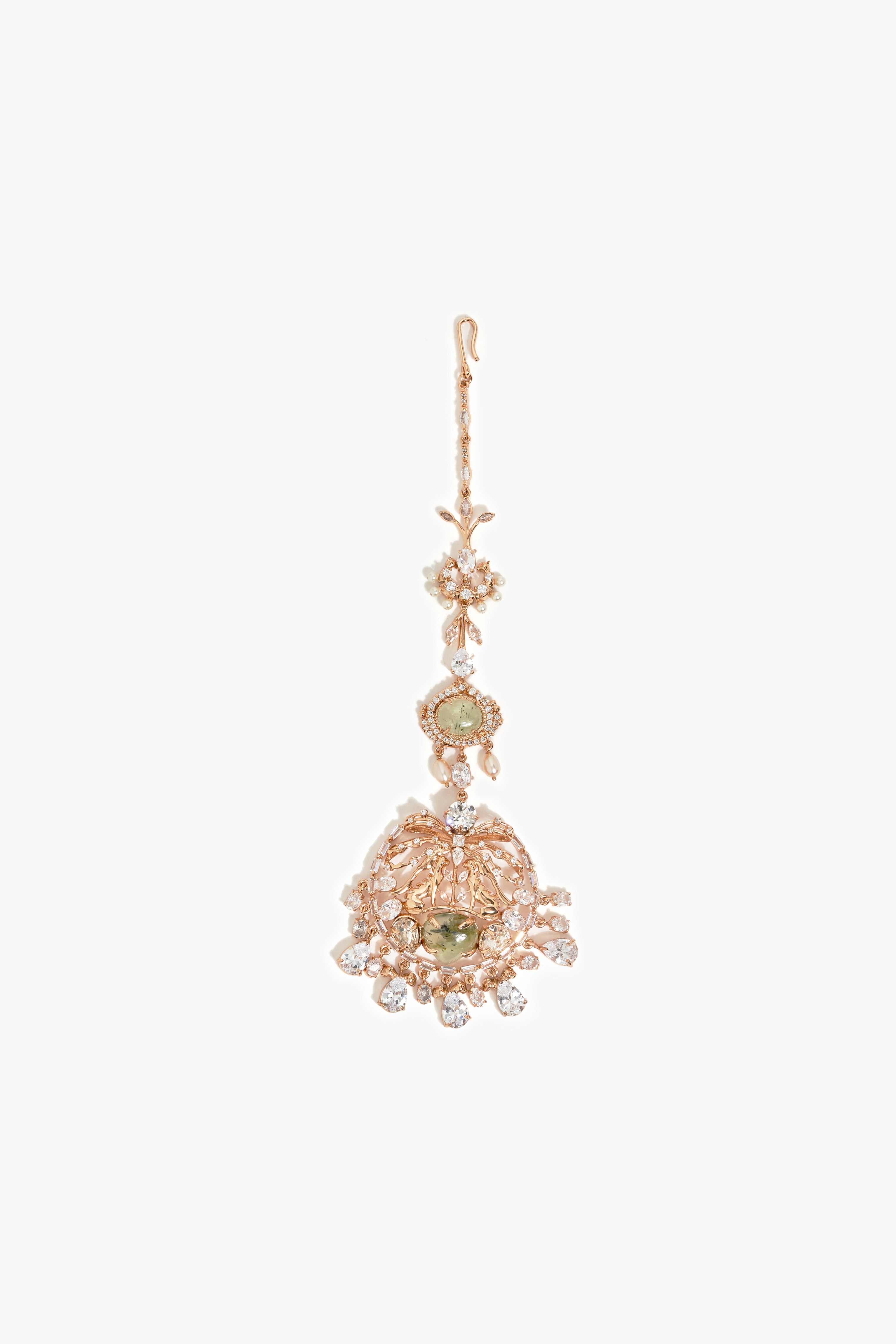 Two iconic leopard motifs converge in regal opposition, their gaze framing a cascade of cubic zirconia in pear, baguette, and oval cuts. At the centre, a luminous prehnite radiates calm, while Swarovski pear stones and oval pearls glimmer with quiet devotion. Finished in 22k rose gold, the tikka crowns the forehead with untamed elegance: a ceremonial jewel of strength, poise, and sovereign majesty. Style it with centre-parted hair or beneath a sheer veil to let its architecture command presence.