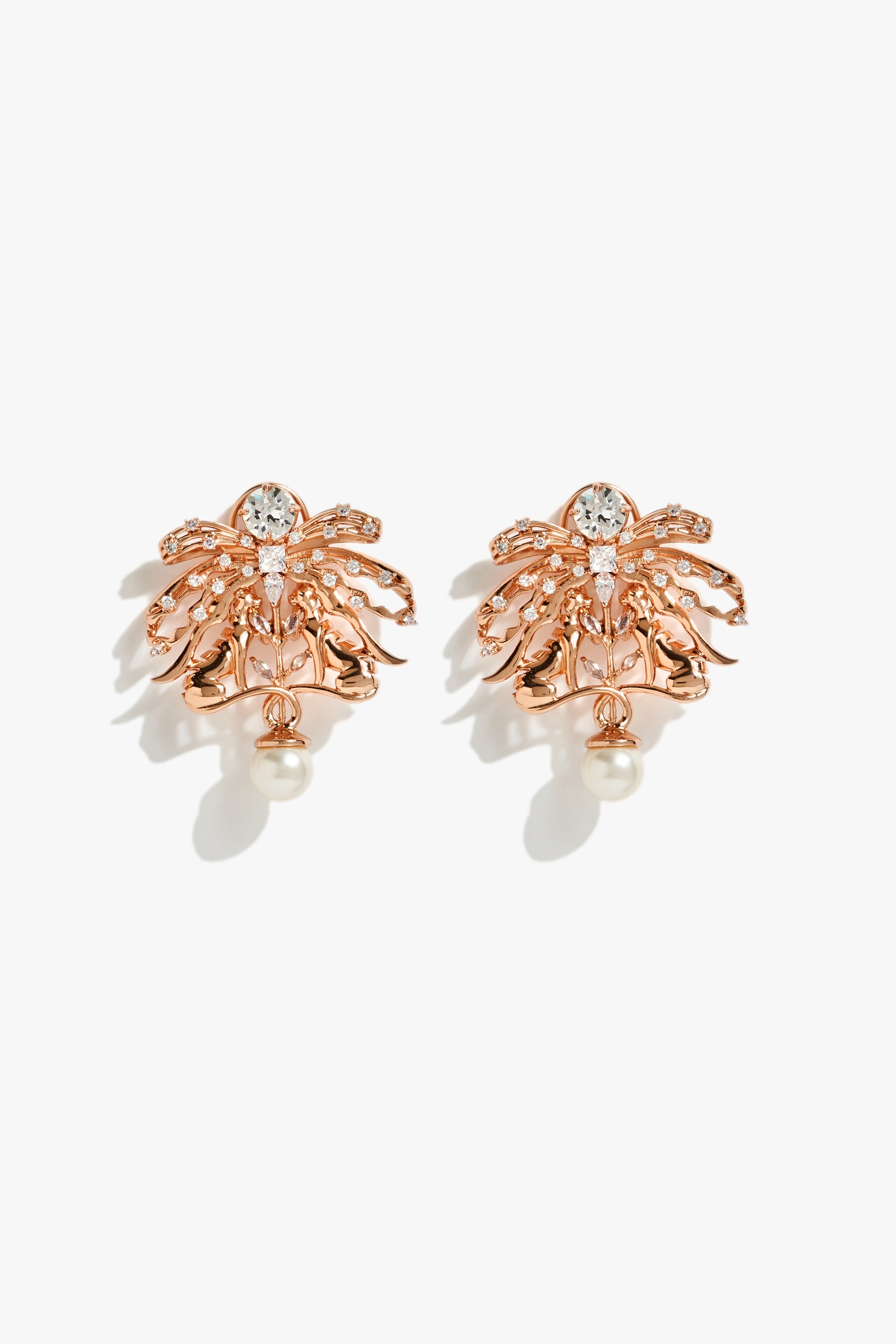 Golden ribbons twist into delicate bows, studded with lustrous pearls and glinting cubic zirconia. At the heart of each knot, twin leopards face one another in sculpted relief—a quiet emblem of strength in symmetry.The interplay of soft curves and fierce forms evokes a ceremonial elegance. Finished in 22k rose gold, these earrings marry playful femininity with untamed instinct—graceful, bold, and beautifully self-assured.