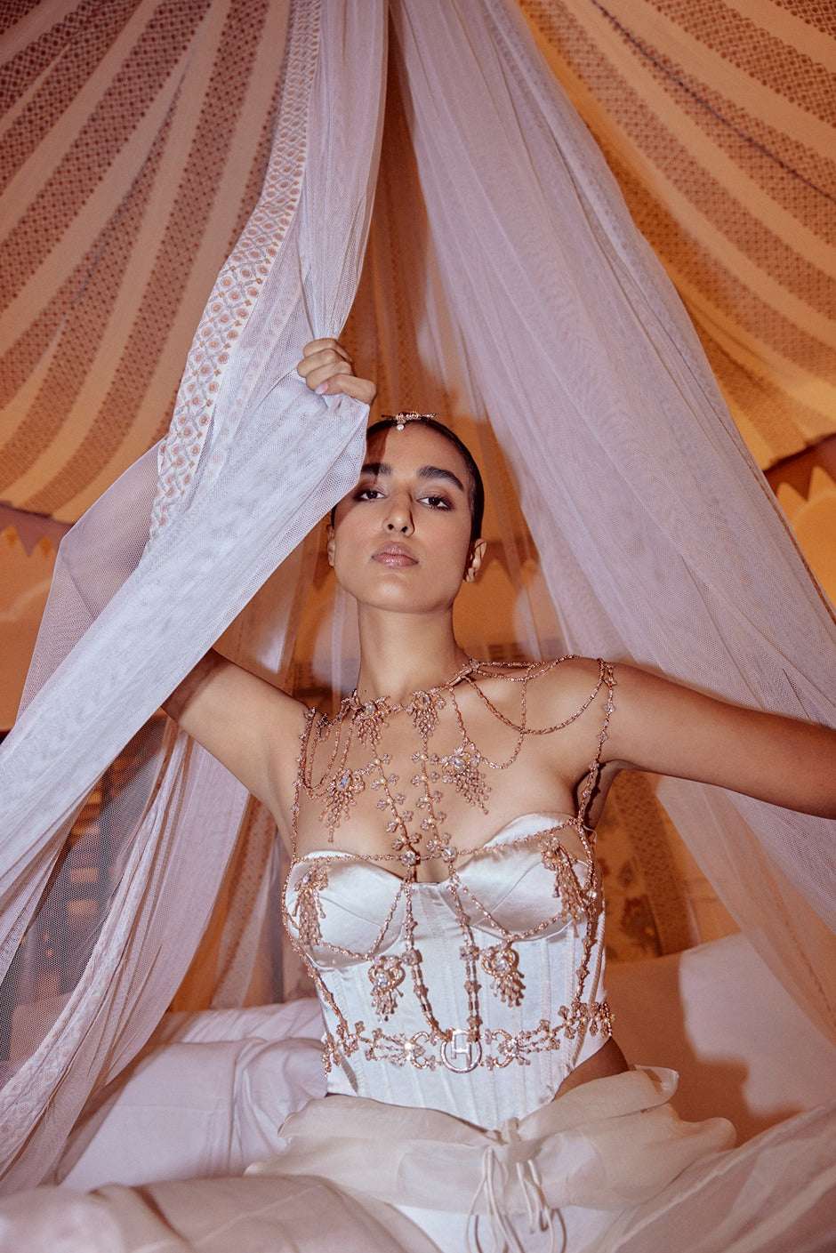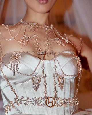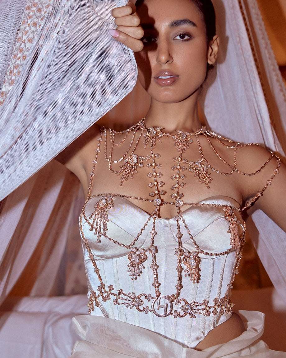 Moreover, the body harness can be paired for an extra dash of a Royal look. This multilayer marvel is the perfect choice to take the glamorous center stage on any occasion with complete regality. Crafted in 22KT rose gold plating, the body cape offers eternal radiance to the wearer.
