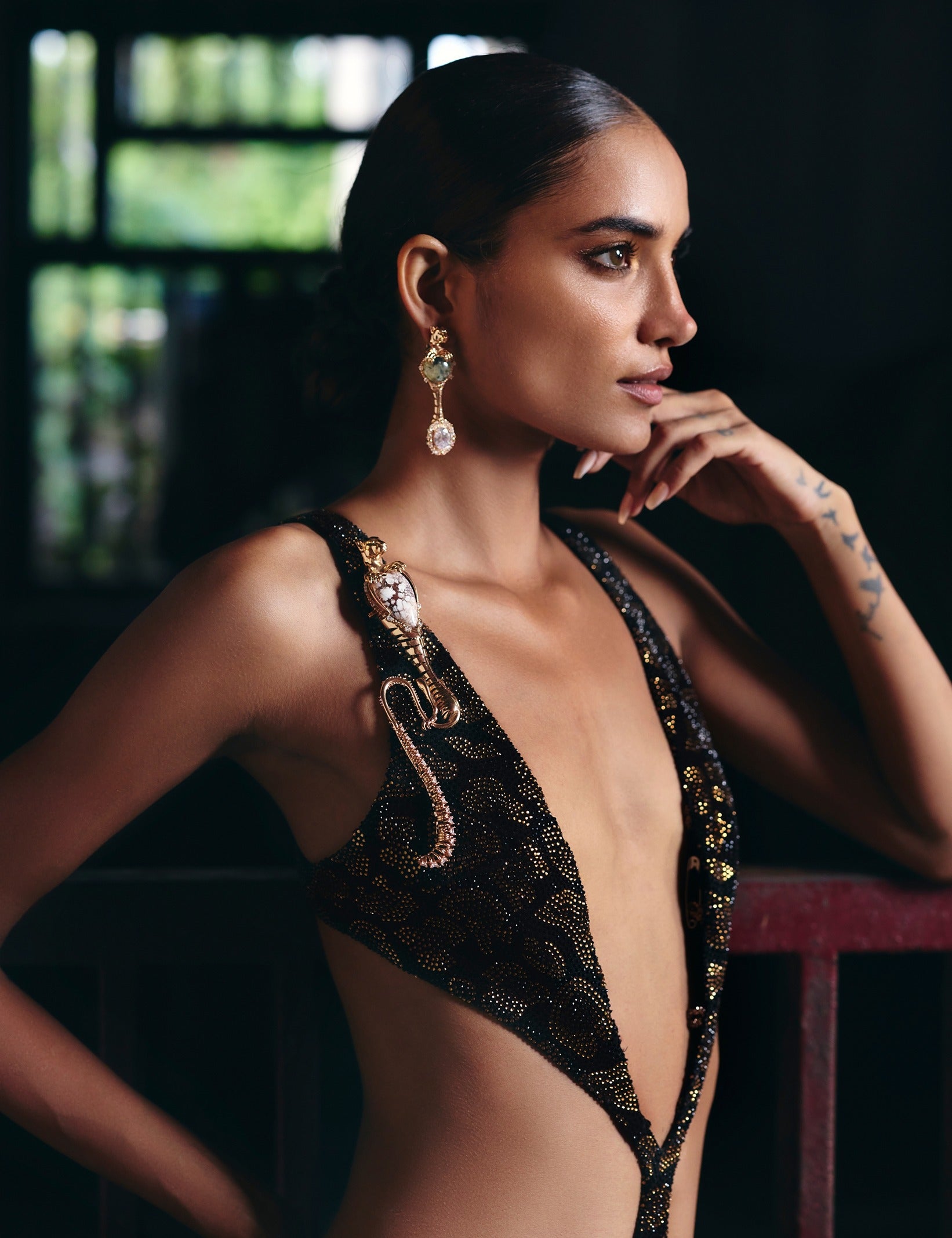 A slender trail of cubic zirconia leads to a sculpted leopard, its tail coiled in poised motion. From its form falls a pale-green prehnite drop, swaying with each movement. Finished in 22k rose gold, these ear drops trace a lithe silhouette — a celestial descent through the wild.