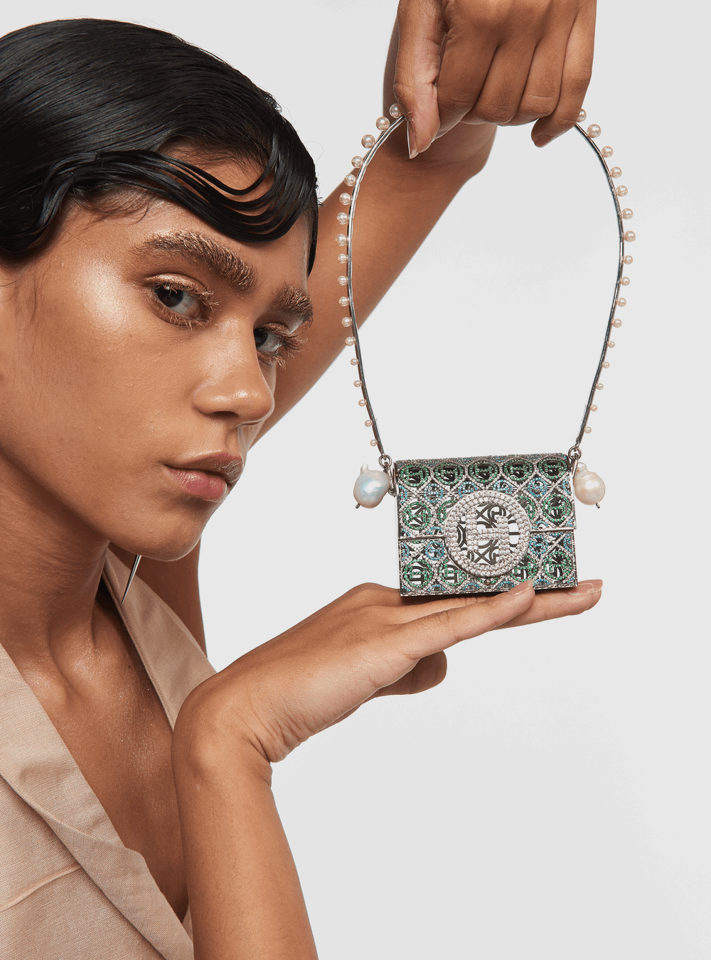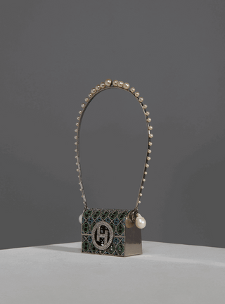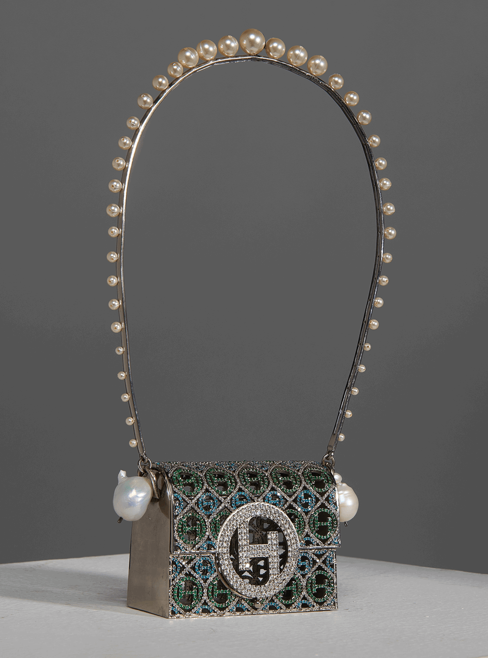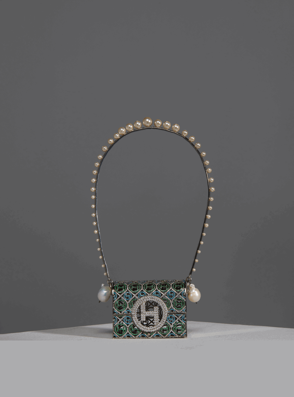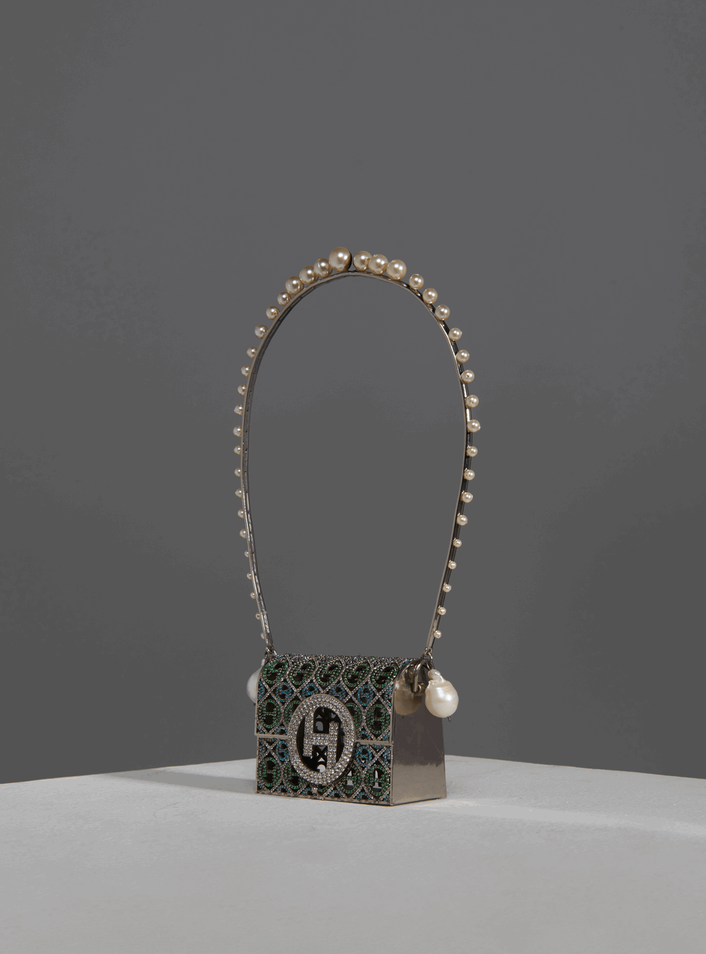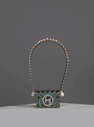 An elegant dialogue between a statement shape and a bejewelled design, the Pico Minaudiere Bag delights with its charming silhouette. Equipped with a striking pearl top handle, the bag is inlaid with the emblematic OH DNA pattern of the House in a pave setting, interlocked with the iconic OH monogram. A compact and elegant structure, the Minaudiere Bag is the perfect companion to embellish any outfit.