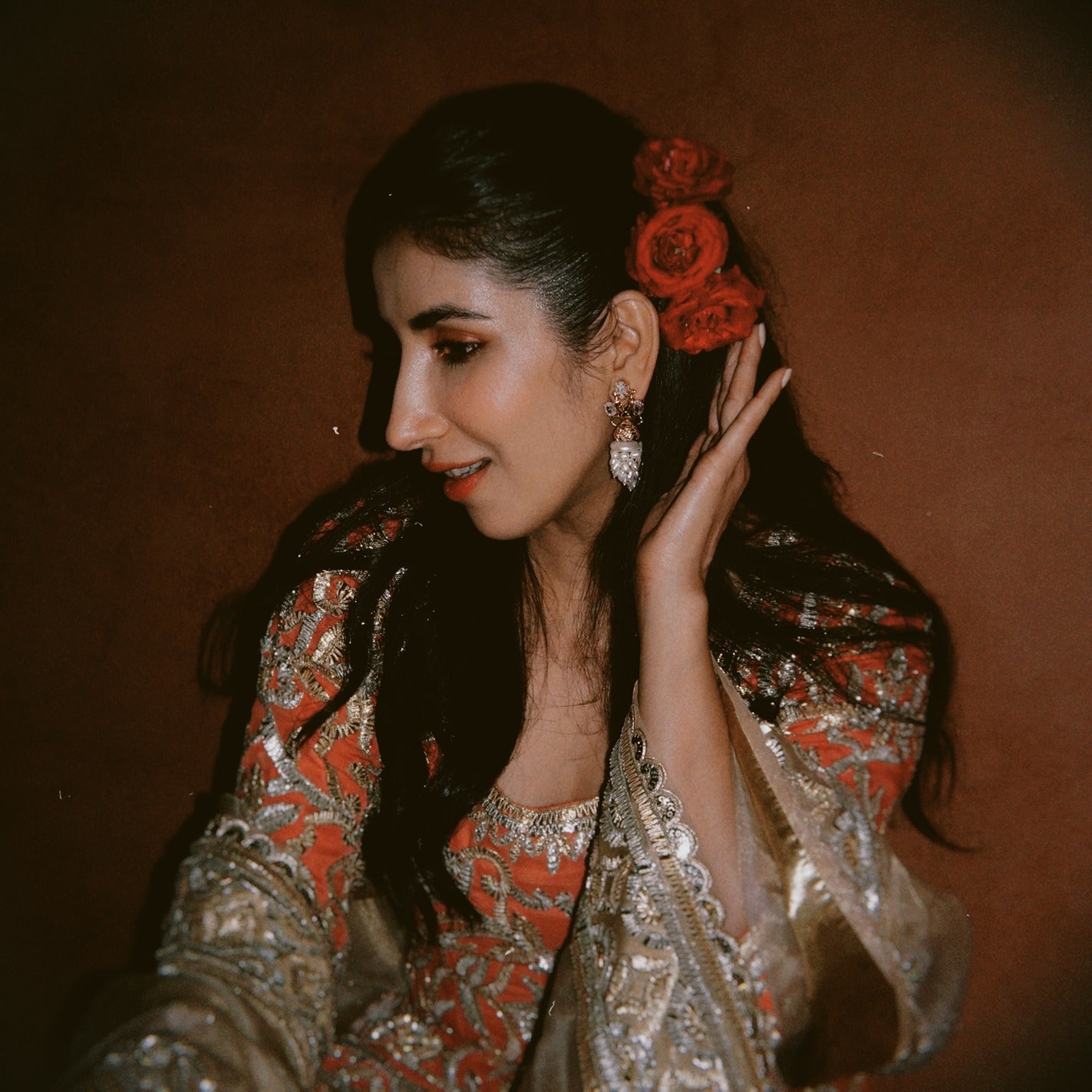 The interplay of soft curves and fierce forms unveils a ceremonial elegance. Pear-shaped Swarovski and oval Signity stones glisten against the glow of disc pearls and freshwater pearls, their contrasts creating a luminous rhythm of light and texture. Finished in 22k rose gold, the earrings transcend adornment to become couture emblems of femininity: graceful, instinctive, and beautifully self-assured.