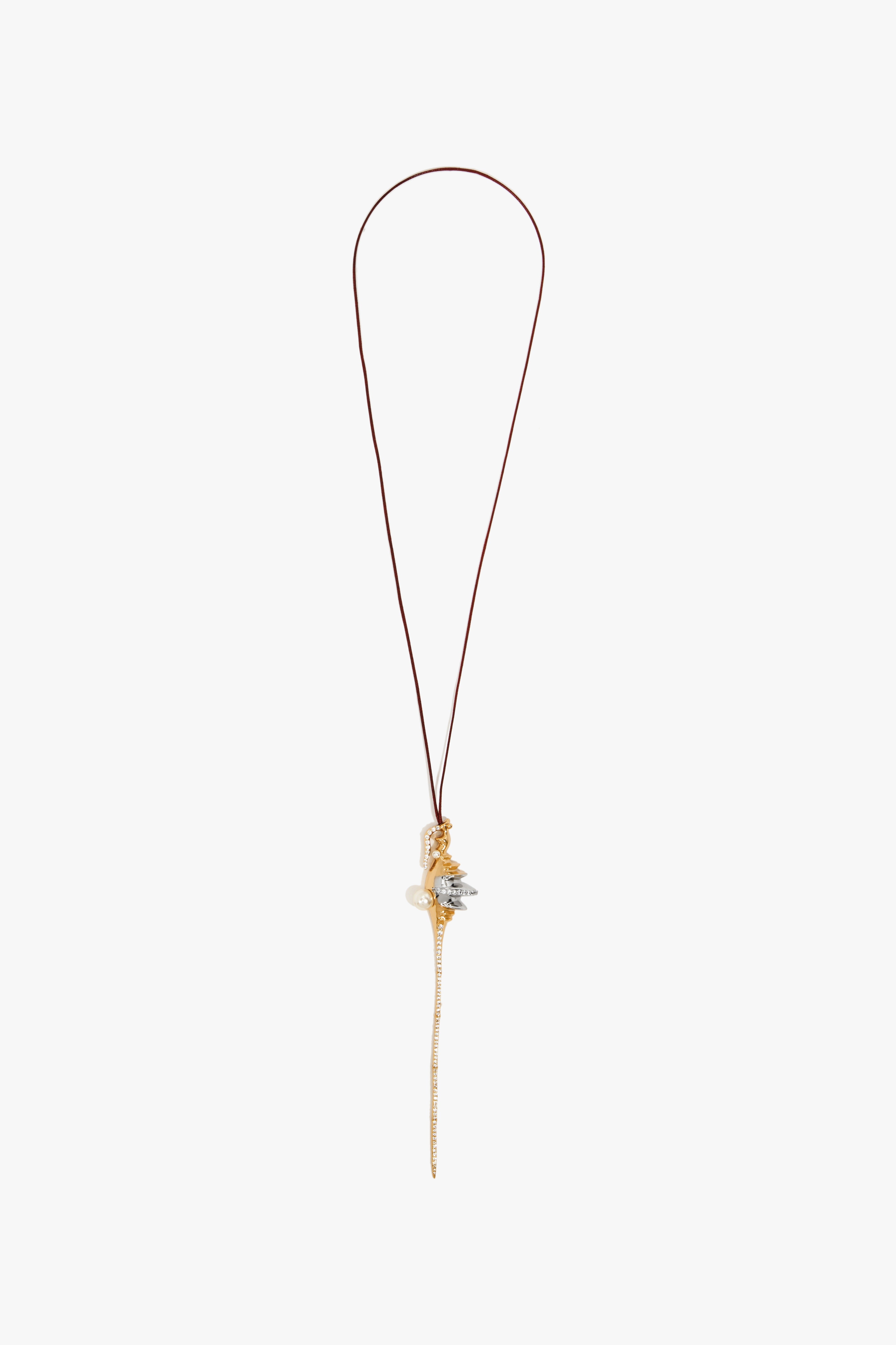 The Seanymph Crestfall Cord Necklace descends in graduating linear forms that guide the eye, sculpted in sleek, flexible snake chains. Cast in 22k gold with a dual rhodium finish, it is traced with finely scattered diamonds, cubic zirconia, and anchored by a Swarovski pearl. Its elongated silhouette recalls the seahorse’s upright posture, balancing structure with simplicity, strength with delicacy.