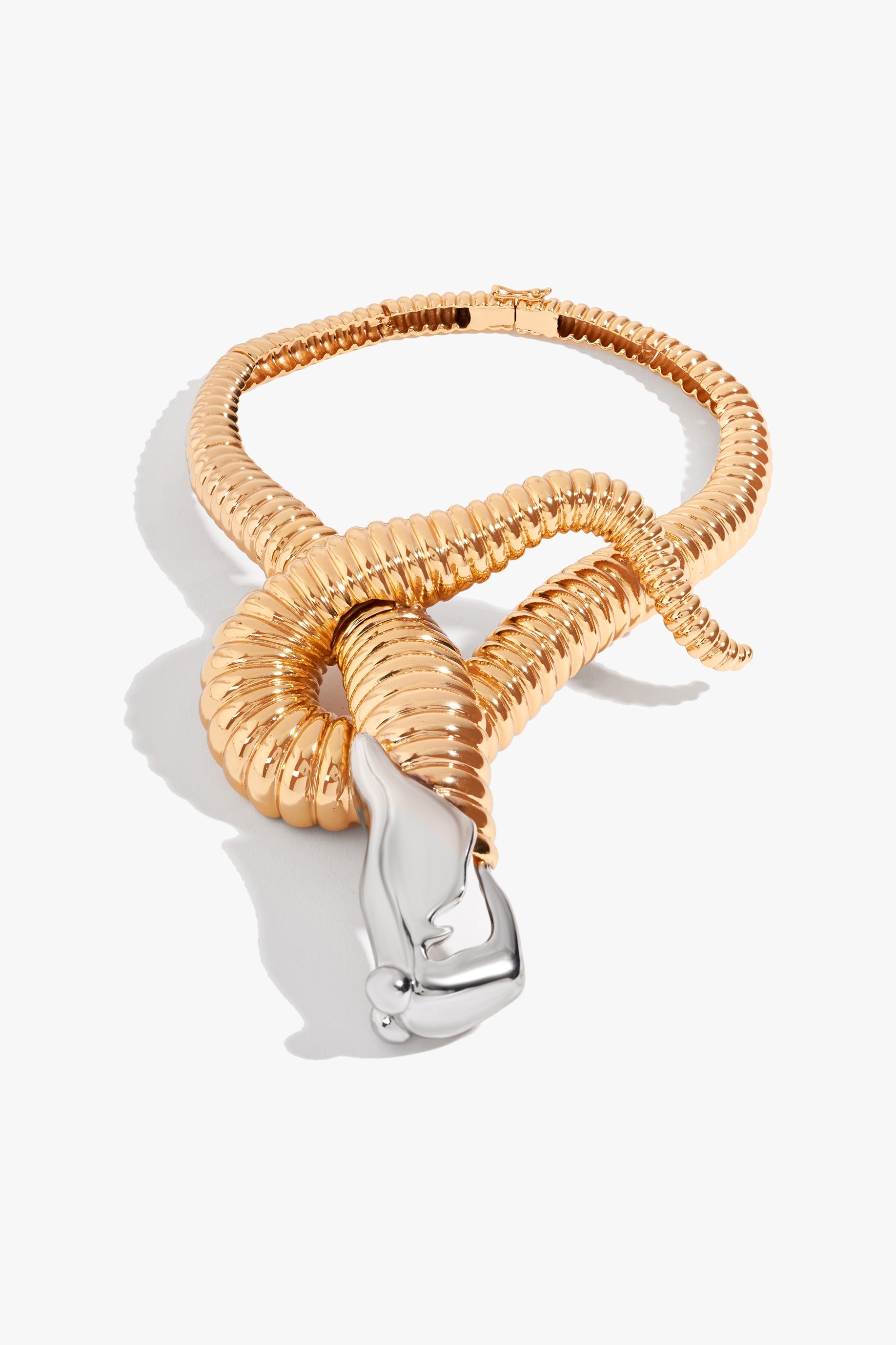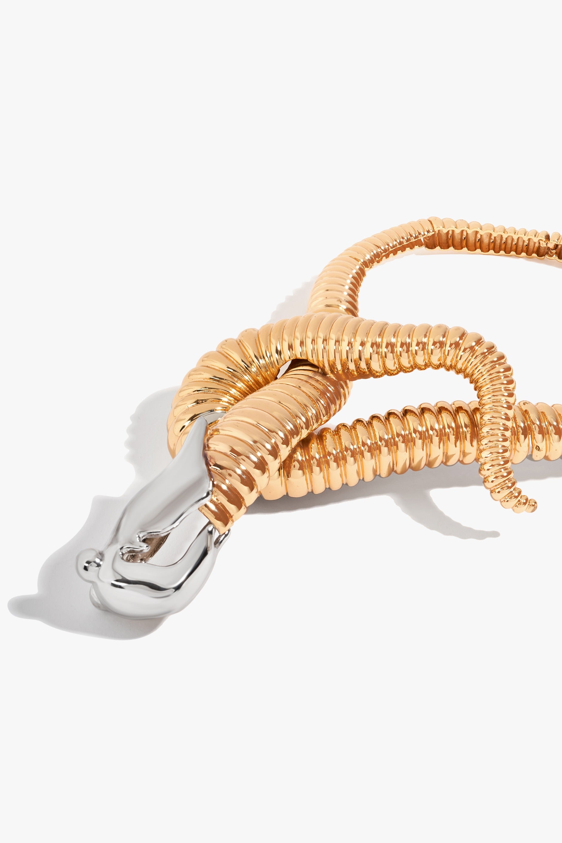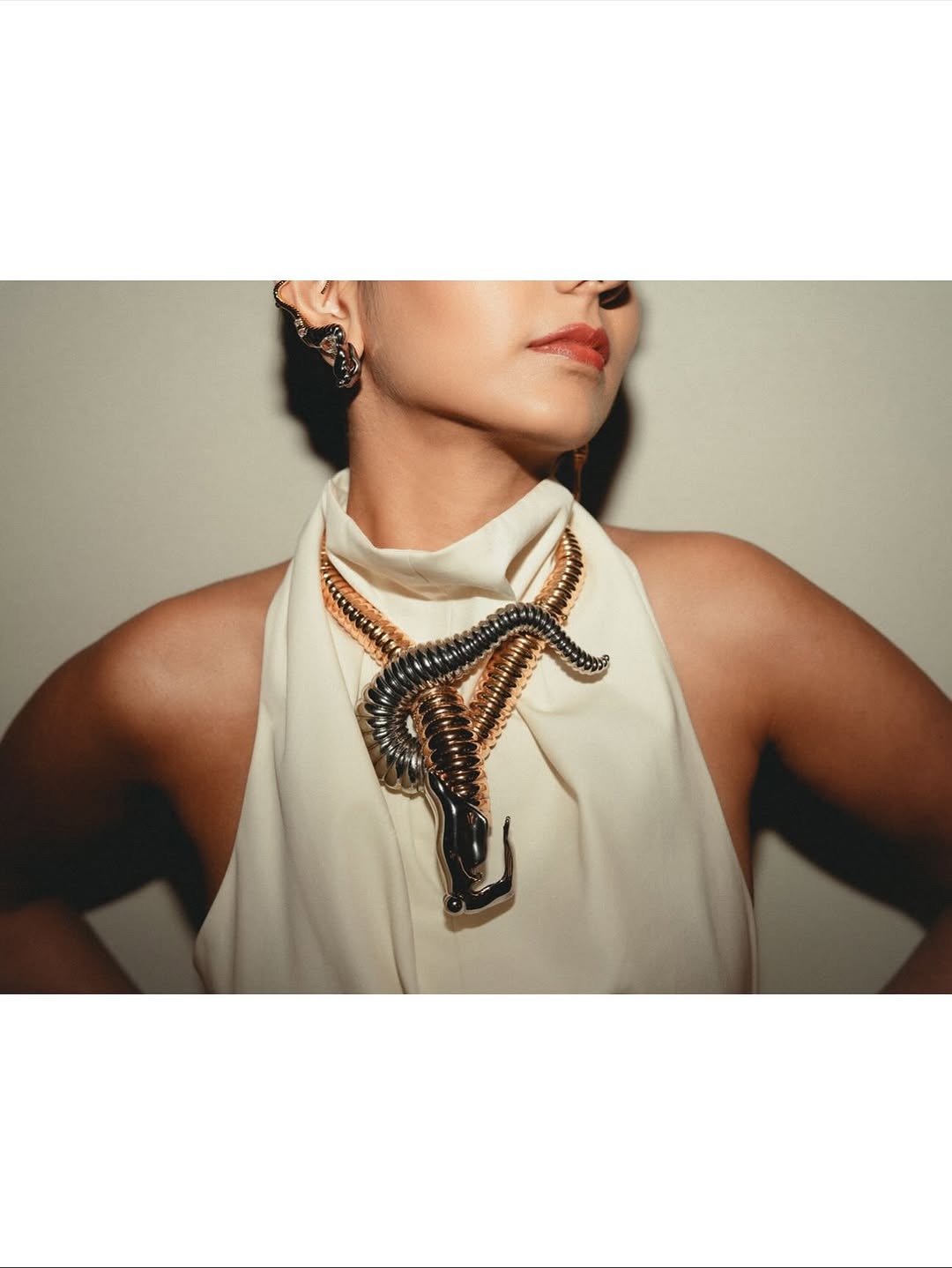 The Seris Dual Choker entwines two sculptural coils: one plated in 22k gold, the other accentuated in silver. Draped at the neck, its duo-metallic form evokes the scaled body of a serpent, fluid yet precise. Jewellery becomes armour, embodying duality and eternal return: a relic of metamorphosis worn close to the skin.