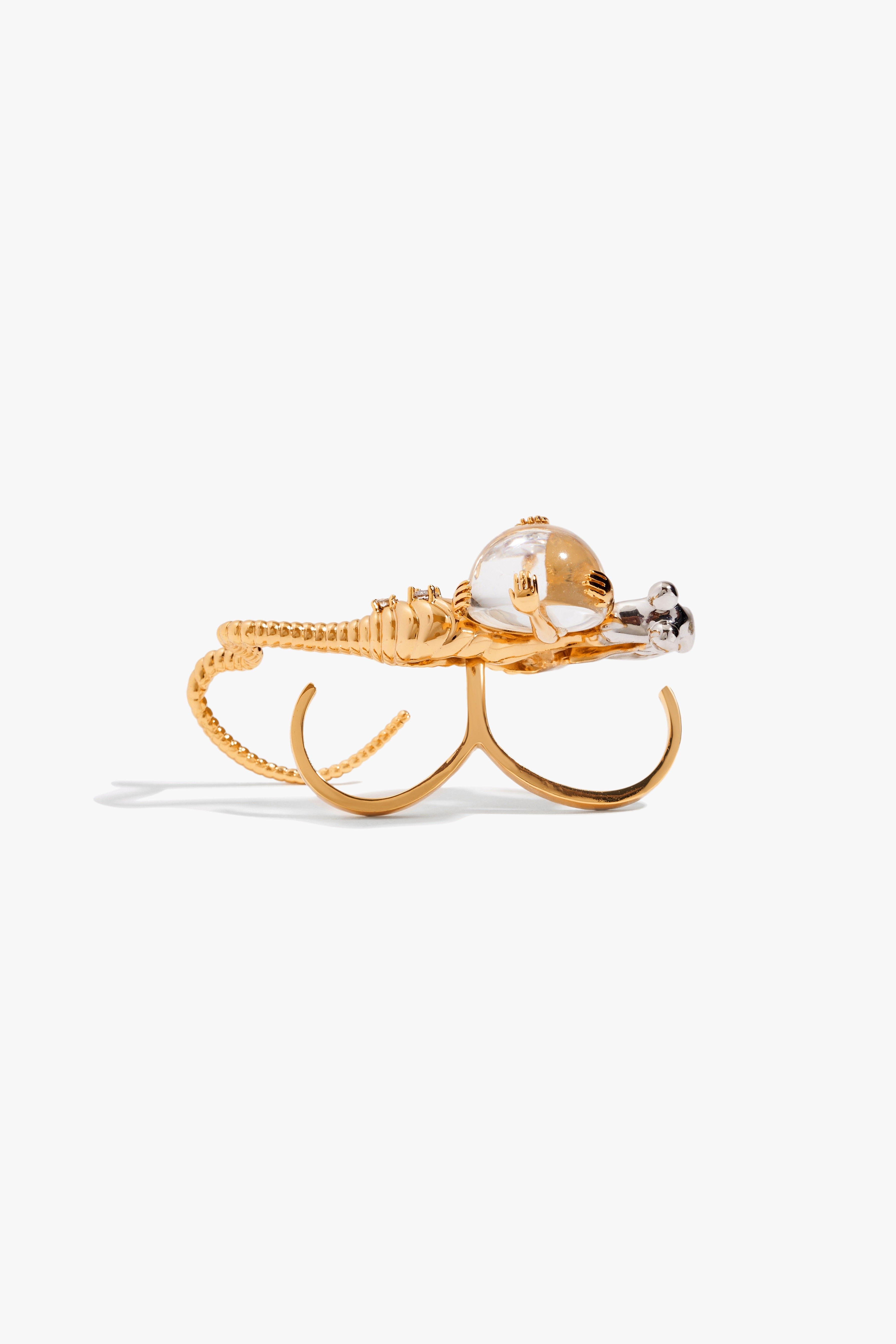 Encasing a resin sphere within duo-metallic coils, the Seris Relic Ring is cast in metal and finished in 22k gold with a dual-tone silver finish. Its curves recall the fluid movement of a serpent, balancing strength with fragility. Set with cubic zirconia and a Swarovski trilliant-cut stone alongside the resin sphere, it becomes a jewel of metamorphosis: transforming the hand into a canvas of light and form.