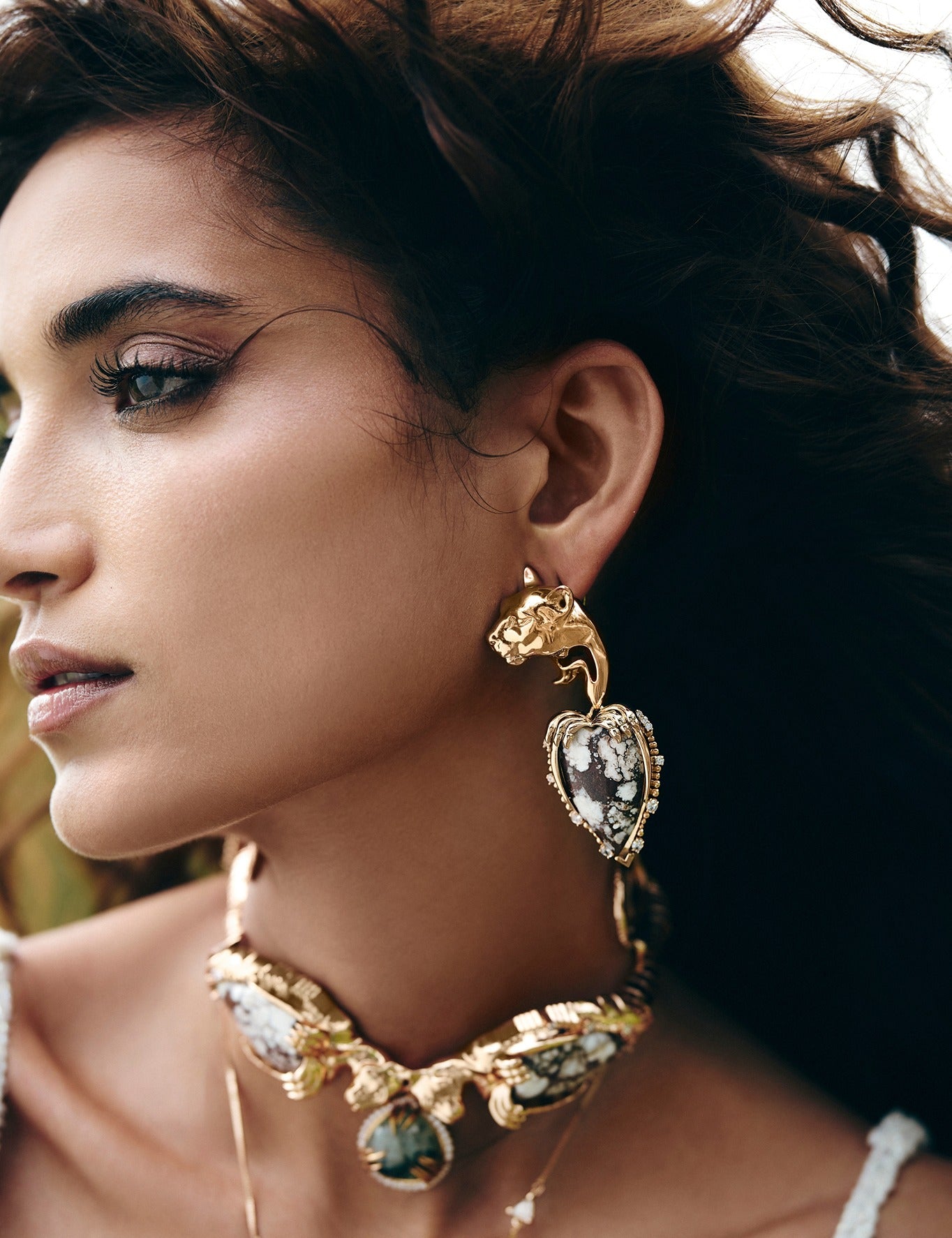 Two golden leopards converge at the edge of a heart-shaped Wild Horse Jasper stone , each sculpted form poised in silent communion. Rimmed in glinting cubic zirconia and finished in radiant 22k rose gold plating, these statement earrings shimmer with quiet power. Worn at the ear, they echo both strength and softness: a harmony of wild spirit and refined elegance.