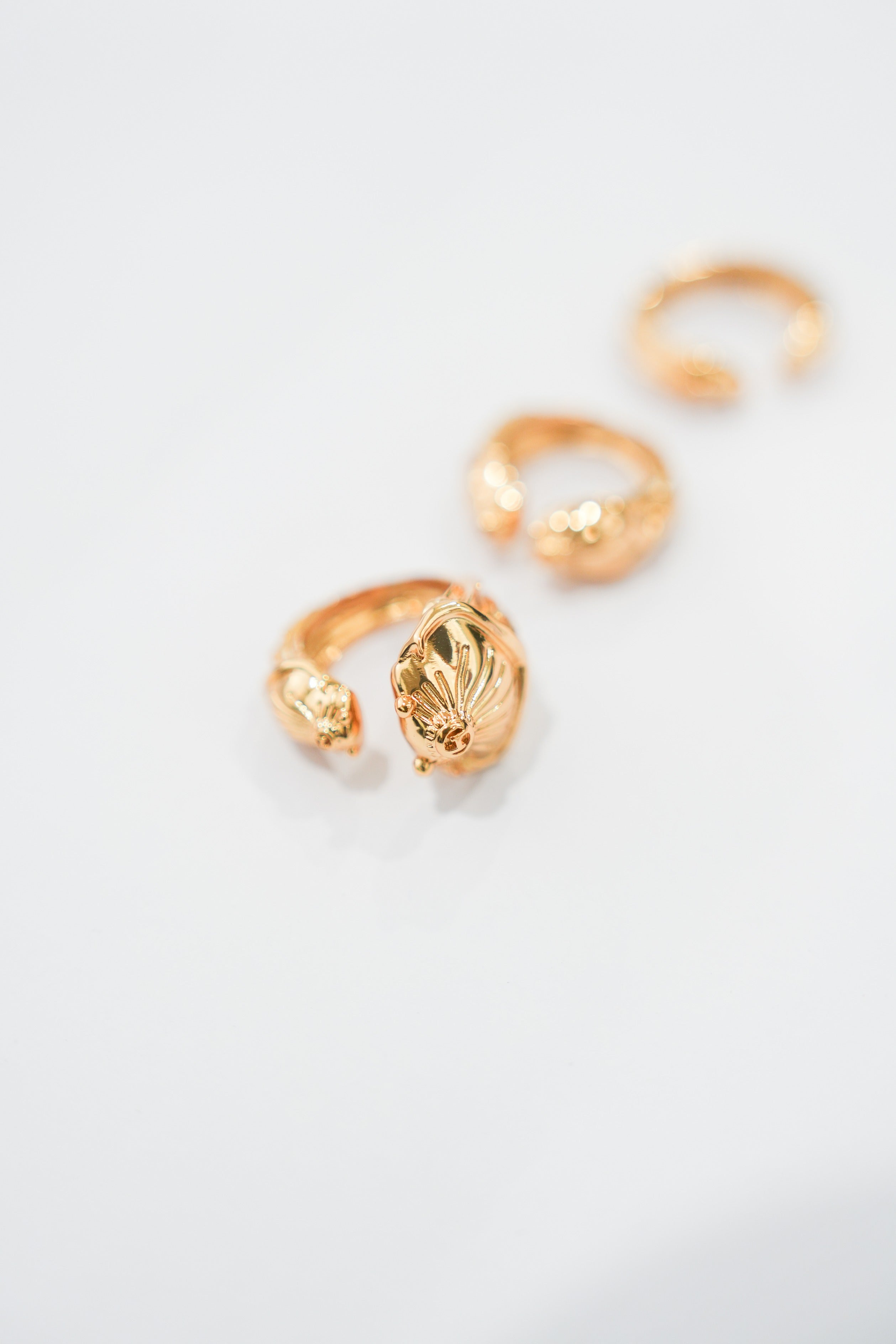 A fragment of nature transformed into couture. The form of a bug’s head, cast in metal and finished in 22k gold, rests upon the hand like a living relic. This adjustable ring is both jewel and adornment, a delicate expression of creation made wearable.