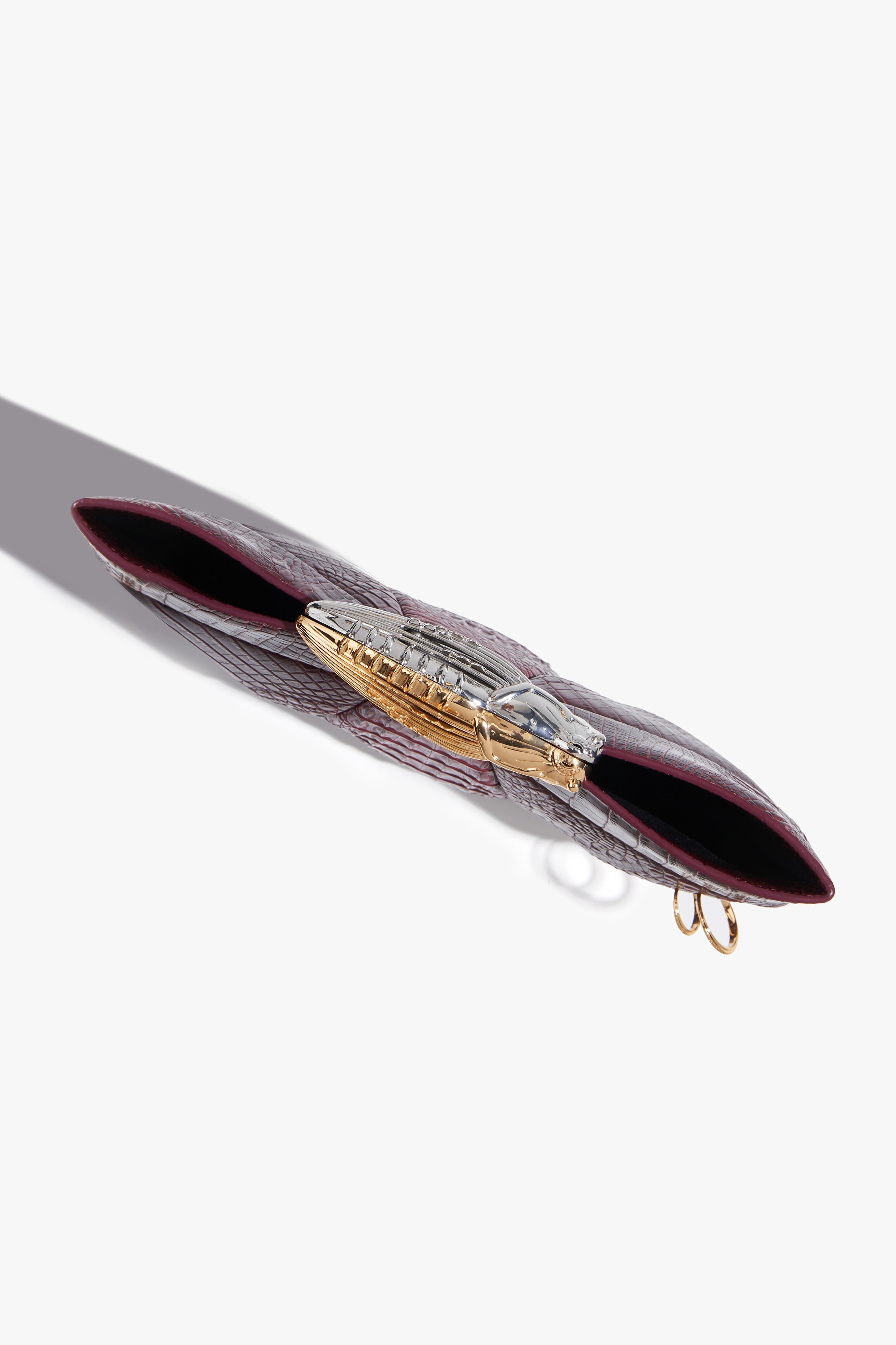 The Koko Klutch is a living emblem of metamorphosis. Crowned with the house’s duo-toned Koko Bug, sculpted in 22k silver and gold-plated metal, it rests upon eco-conscious textured crimson leather like a creature upon its own body, breathing with quiet authority.
