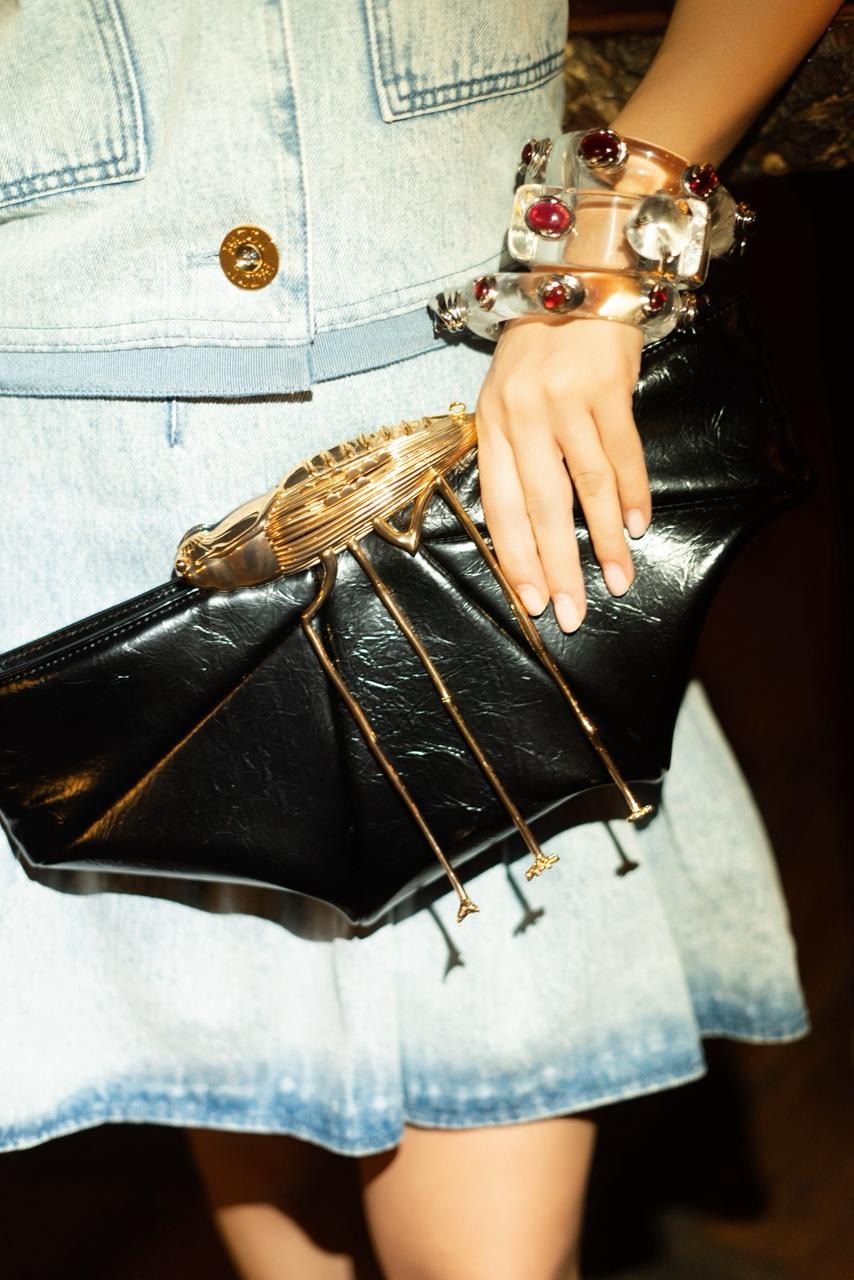 The Koko Runway Klutch is theatre made tangible. A sculptural apparition, it stands on gilded legs, its silhouette crowned by a top-handle unfurled from the wingspan of the house’s emblematic Koko Bug.