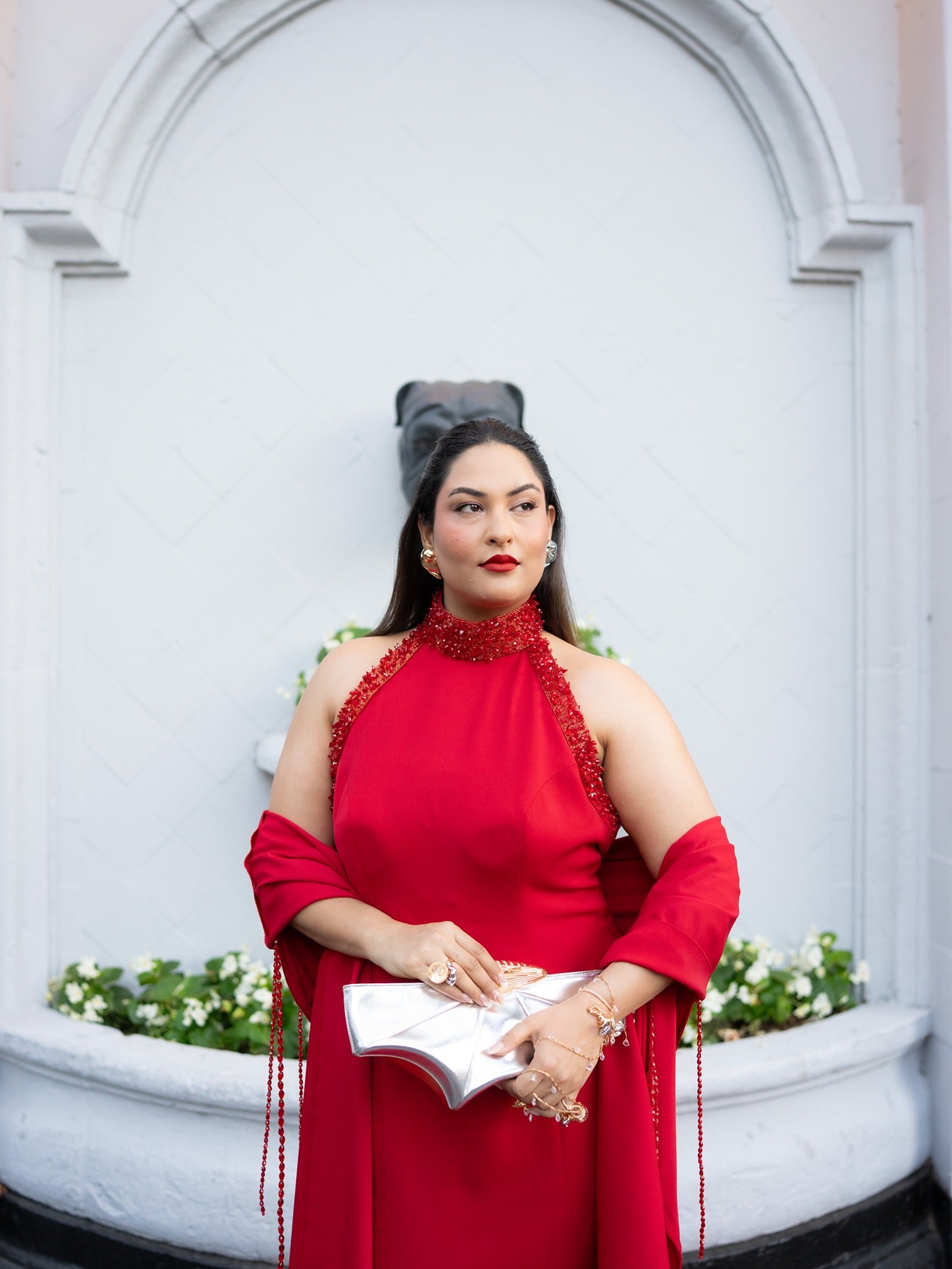 Draped in molten silver and gold, its form captures light as if forged in alchemy. Encircled by gilded rings, suspended like jewels in orbit, the clutch transcends function to become a relic of transformation a surreal artefact of selfhood and expression. To carry it is to hold alchemy itself: intimate yet commanding, contemporary yet eternal. A fragment of becoming, rendered into form.