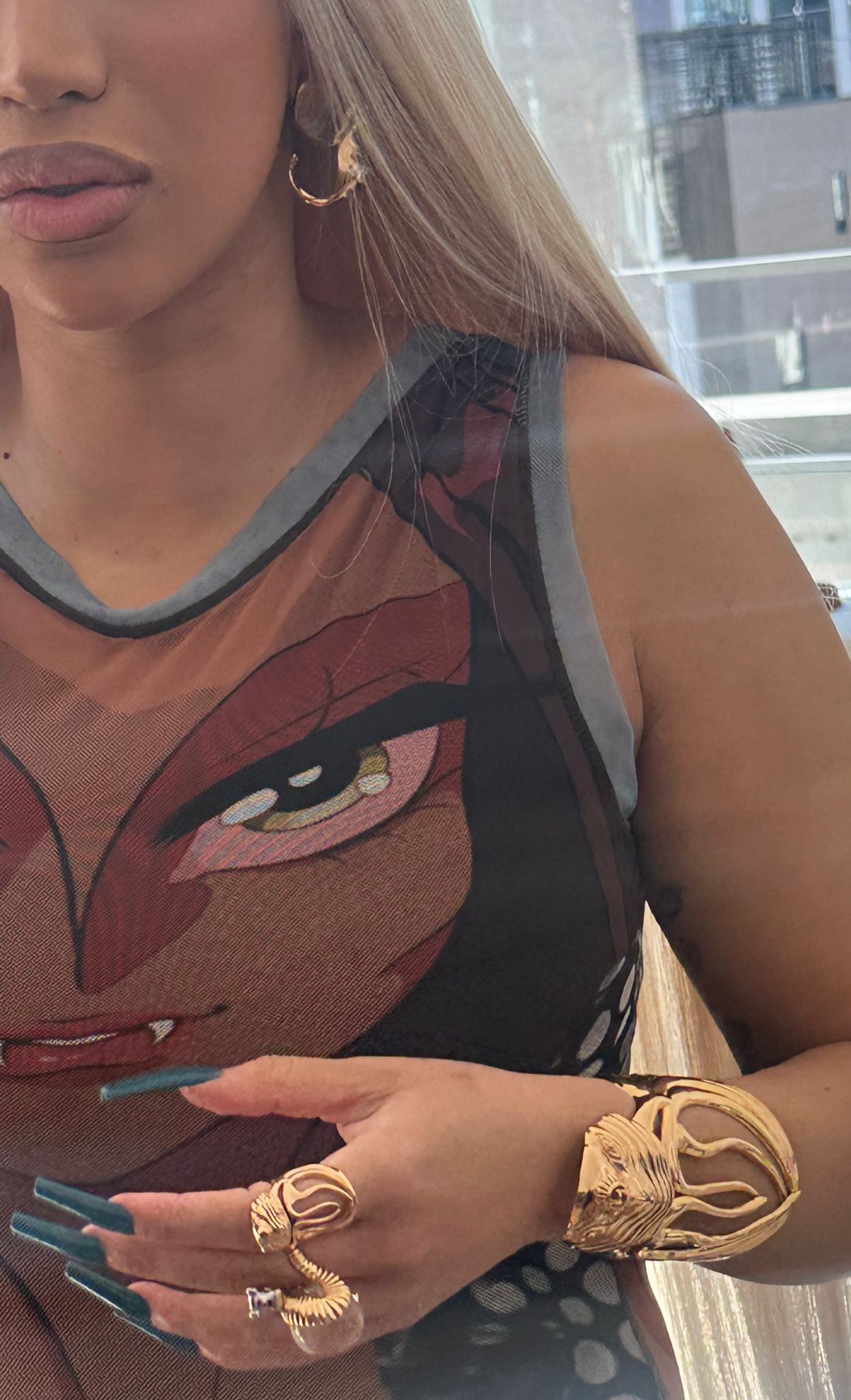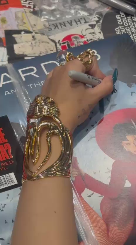 Sculpted in 22k gold-finished brass, this cuff’s three upward forks form a structured, flame-like silhouette. Each prong rises from the band like a sacred spine, its bold form softened by slender arcs emerging from the Koko bud’s head. The Koko Statement Cuff stands as both prayer and proclamation, branching, blooming, becoming: a wearable sculptural talisman of feminine power.