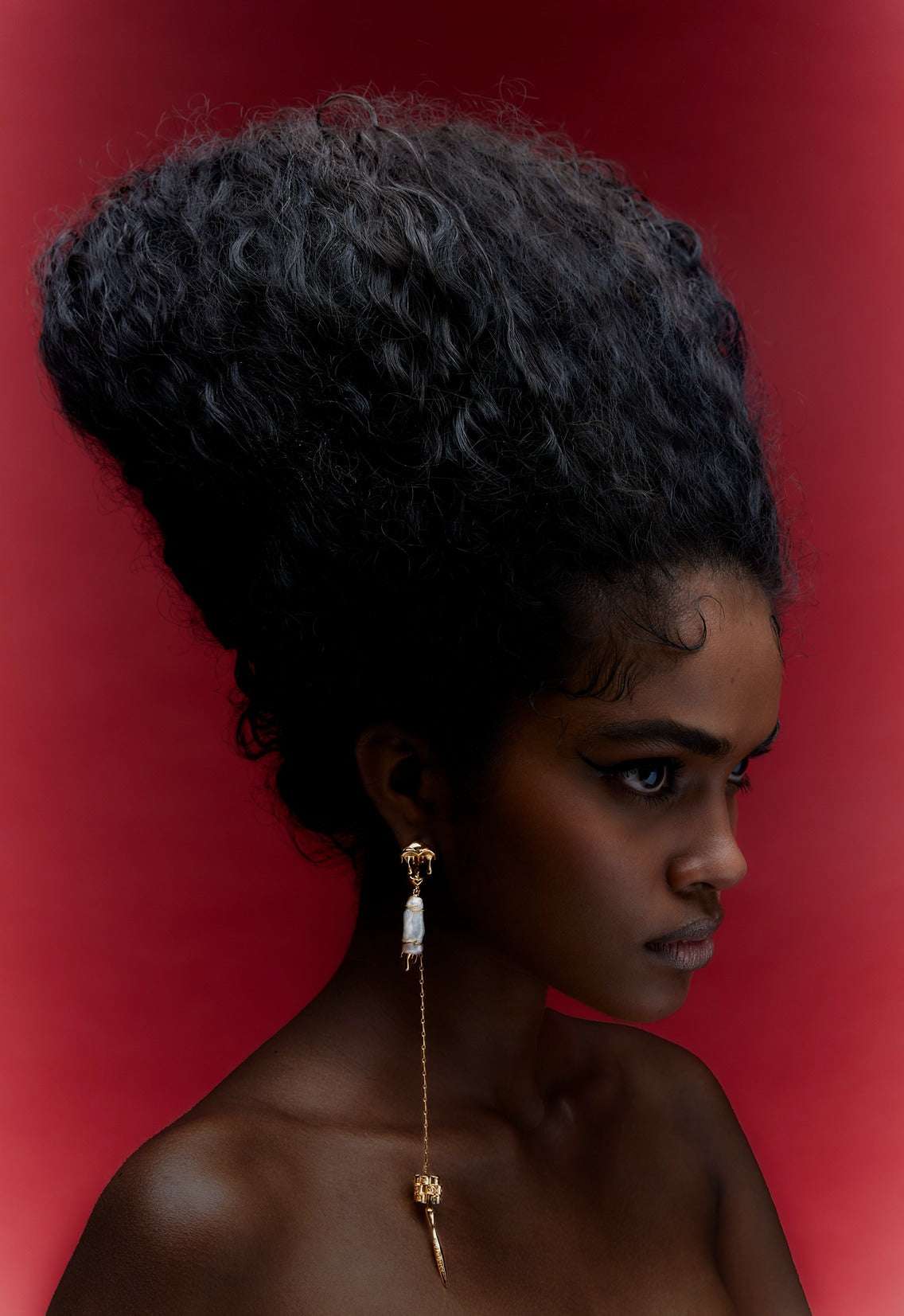 The Shroom Shoulder Grazers defines an expression of unparalleled elegance that gracefully descends to your shoulders. These carefully crafted earpieces showcase keshi pearls suspended from the Shroom motif and can be styled in two ways with delicate detachable chains that feature golden poppi flowers. The result is a timeless symphony that sprinkles sophistication like stardust onto any ensemble it graces.