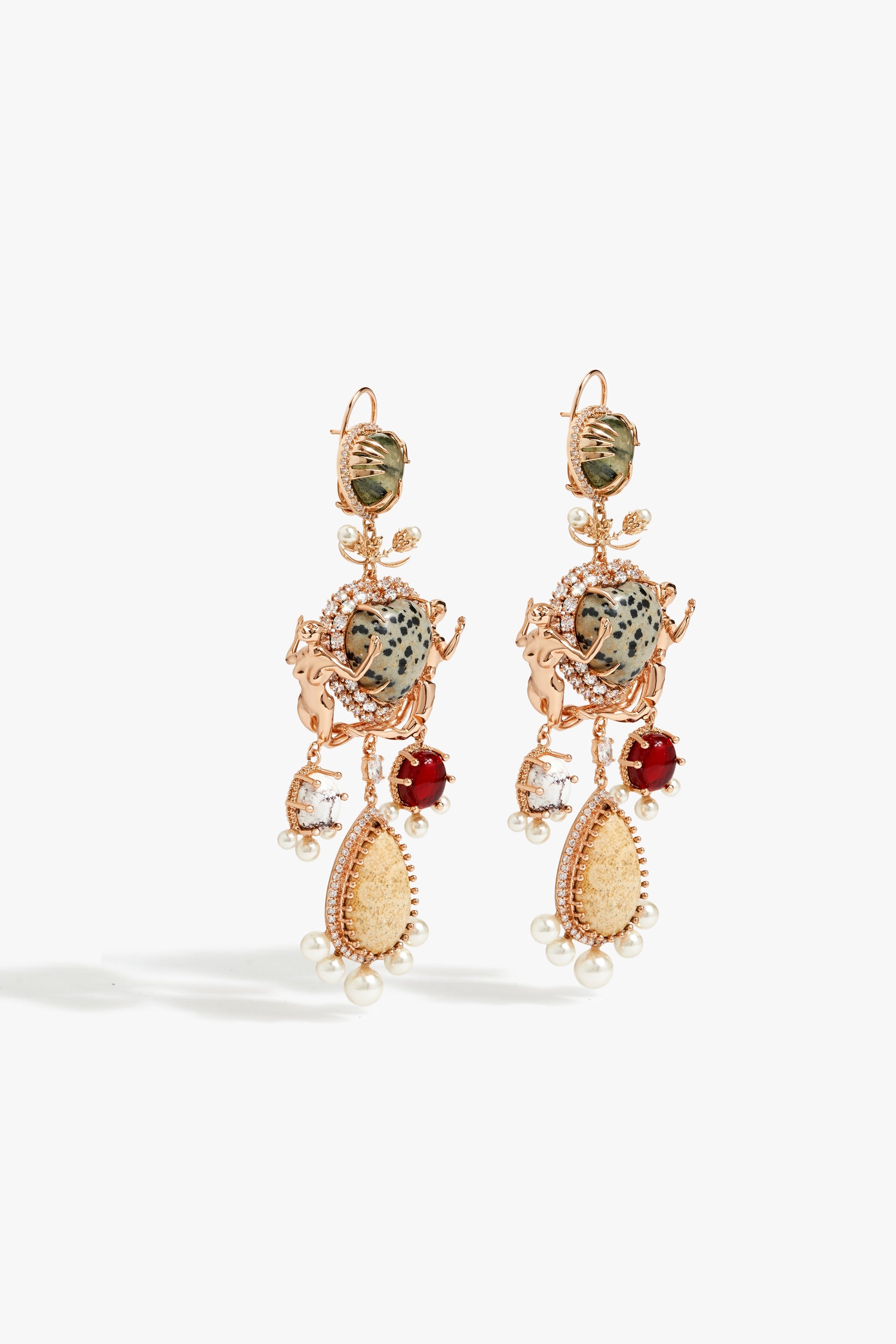 Two sculpted leopard bodies face away yet remain bound in mirrored symmetry. Their forms cradle fossil corals, oval wild horse jasper, and pear-shaped prehnite, while maroon glass stones and Dalmatian hearts add rare, untamed beauty. Swarovski pearls and CZs scatter brilliance across the design. Finished in 22k rose gold, the earrings embody both strength and sensuality: a wild relic crowned in couture grace.