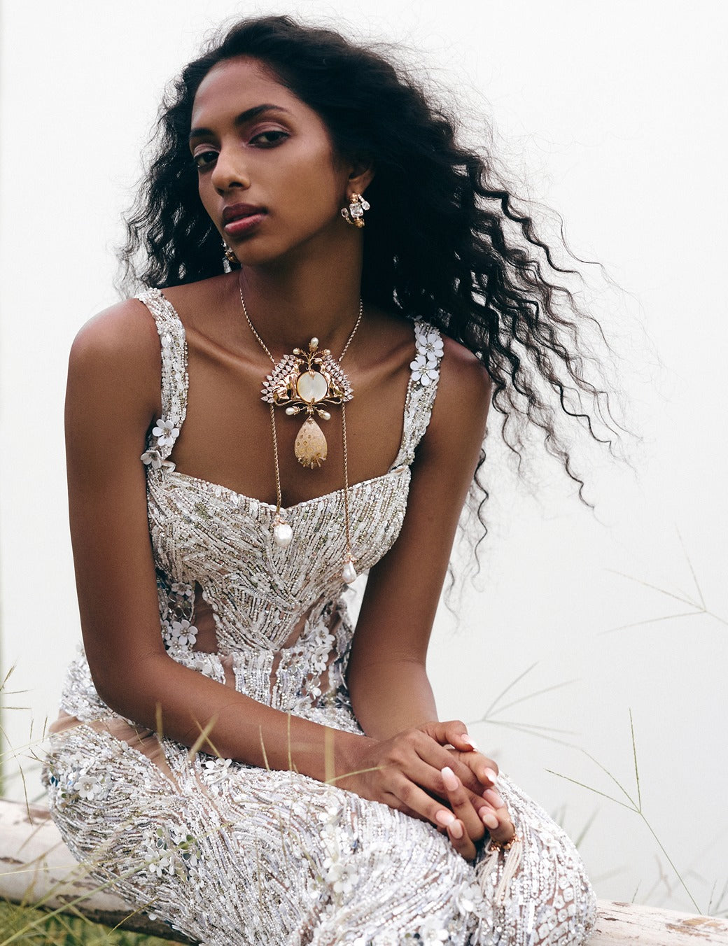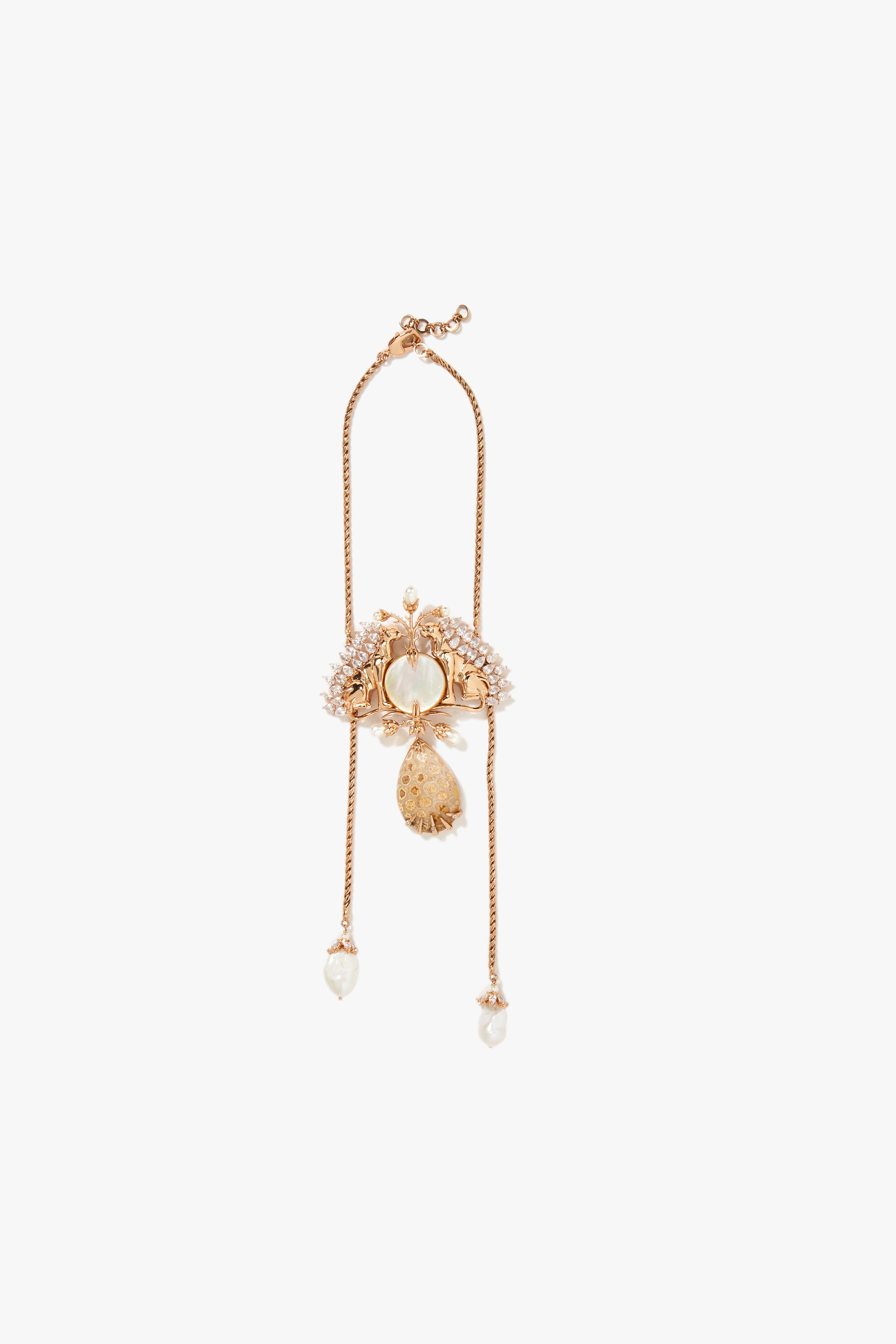 Two leopard motifs converge in regal symmetry, their forms framing a composition of rare stones and luminous pearls. Marquise-cut cubic zirconia glimmer with precision, while pear-shaped fossil coral and discs of mother-of-pearl bring the quiet depth of nature’s textures. Drop-shaped pearls and baroque pearl hangings cascade in fluid rhythm, softening the design with a touch of radiance. Finished in 22k rose gold, the necklace becomes a talisman of strength and grace, sculpted to crown the neckline with untamed elegance.